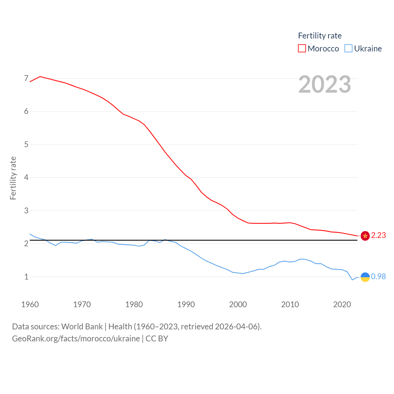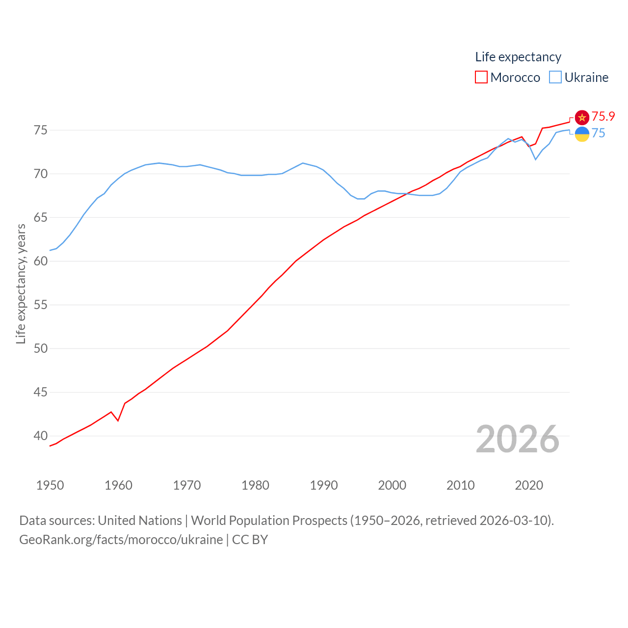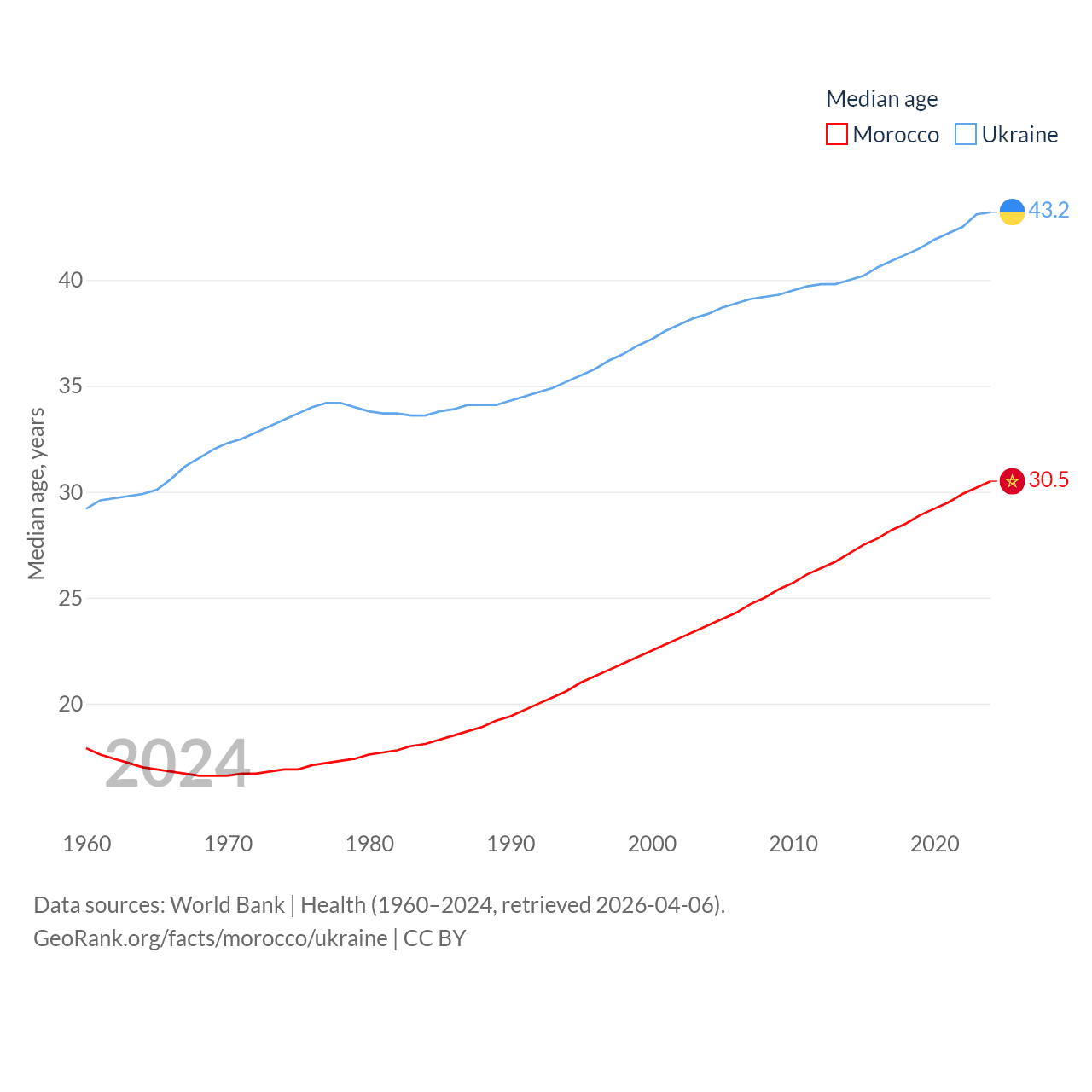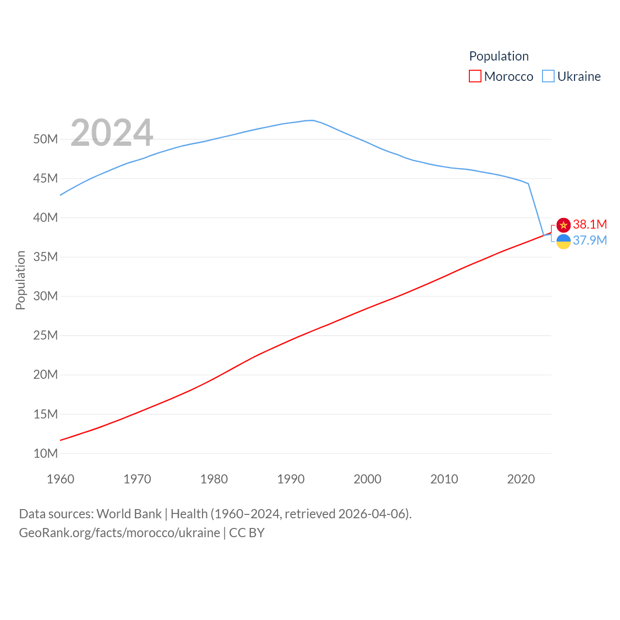 Morocco has a population of 38.1M (ranked 39/197), compared with 37.9M in Ukraine (ranked 41/197). Morocco's land area is 172,317 sq mi versus 223,708 sq mi for Ukraine (ranked 55th vs. 46th).