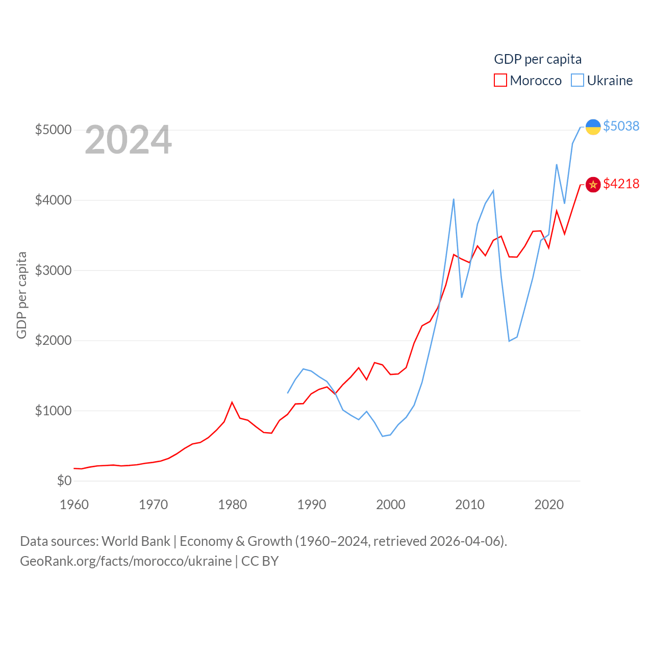By GDP, Morocco ranks 58/197 ($161B) and Ukraine ranks 57/197 ($191B). By GDP per capita, Morocco ranks 127/197 ($4,218), while Ukraine ranks 120/197 ($5,038).
