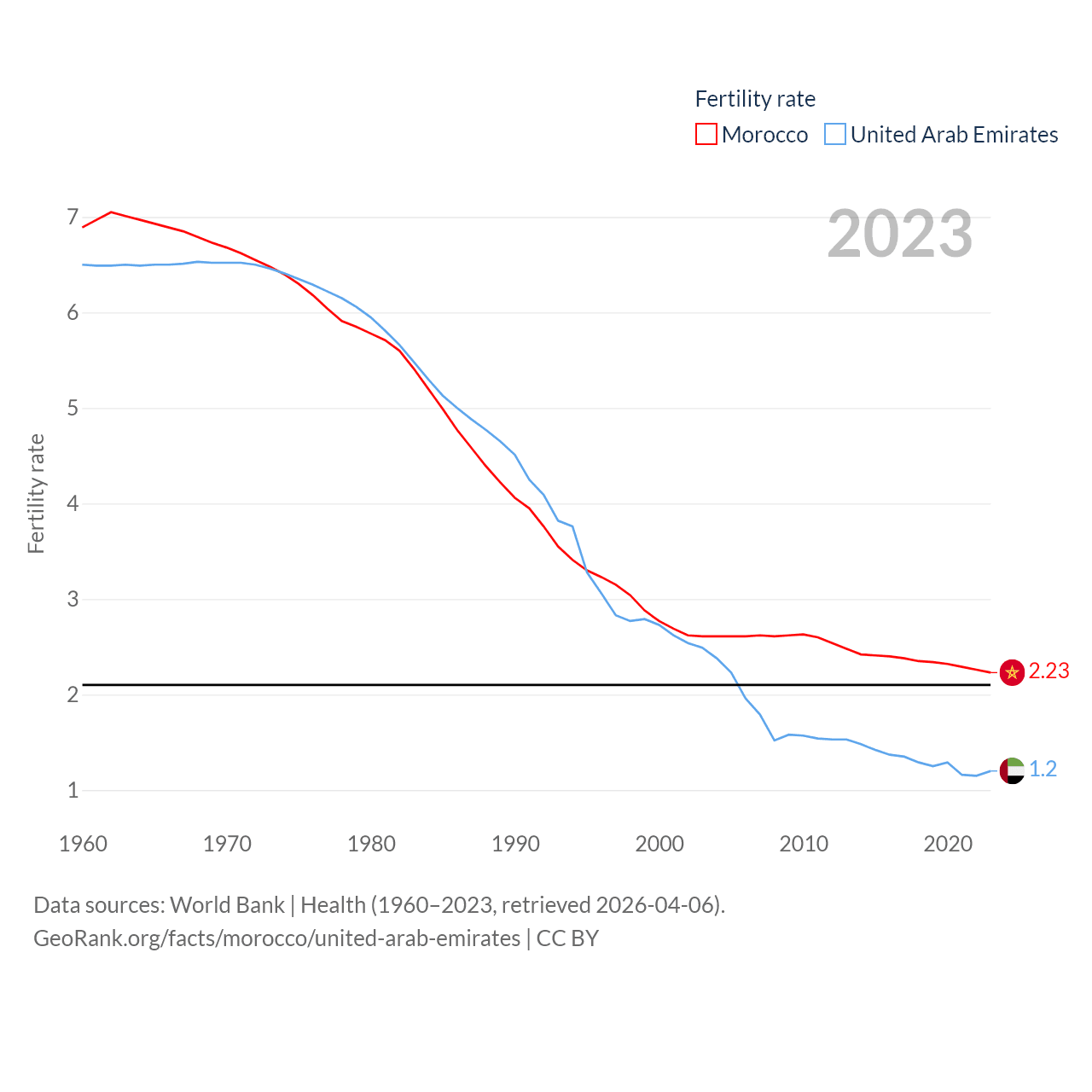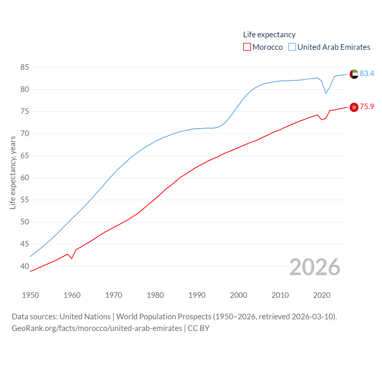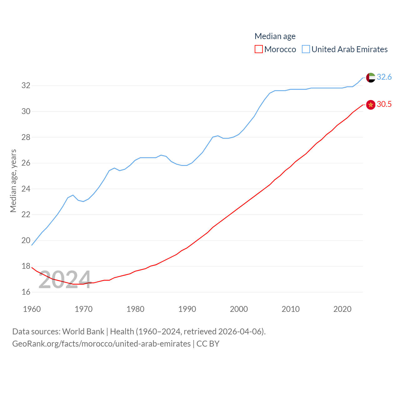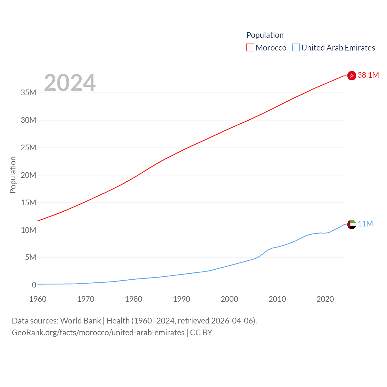 Morocco has a population of 38.1M (ranked 39/197), compared with 11M in The United Arab Emirates (ranked 86/197). Morocco's land area is 172,317 sq mi versus 27,421 sq mi for The United Arab Emirates (ranked 55th vs. 117th).