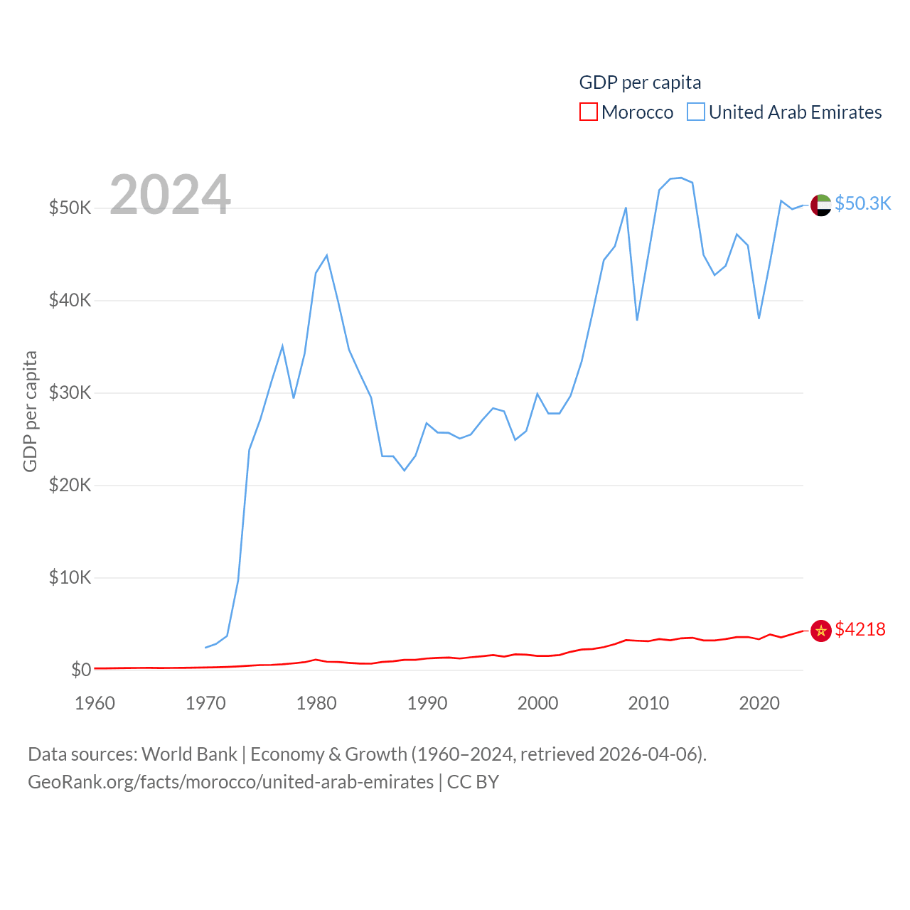 By GDP, Morocco ranks 58/197 ($161B) and The United Arab Emirates ranks 27/197 ($552B). By GDP per capita, Morocco ranks 127/197 ($4,218), while The United Arab Emirates ranks 24/197 ($50,274).