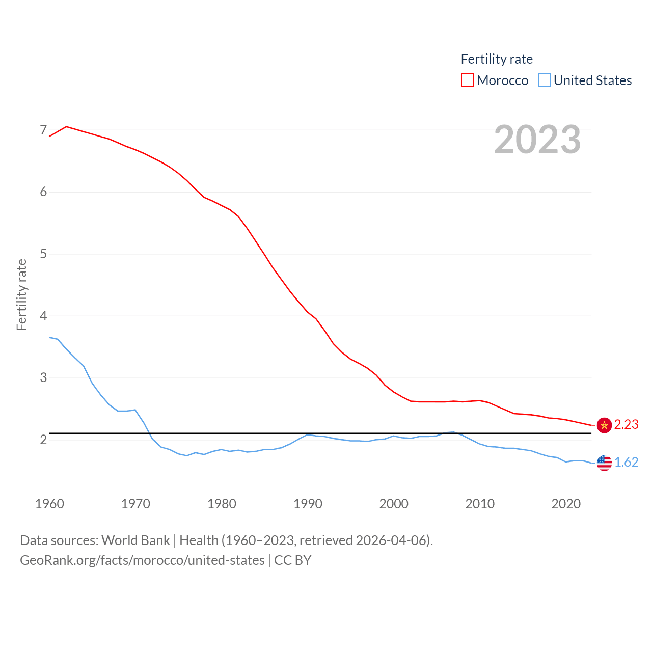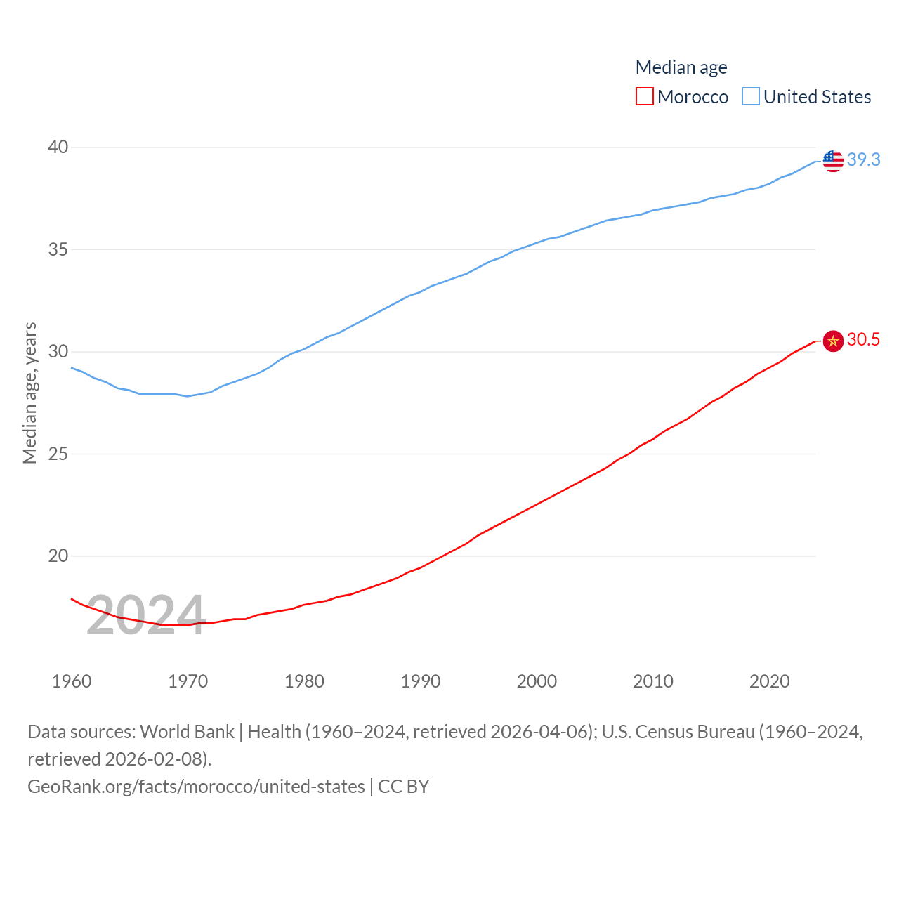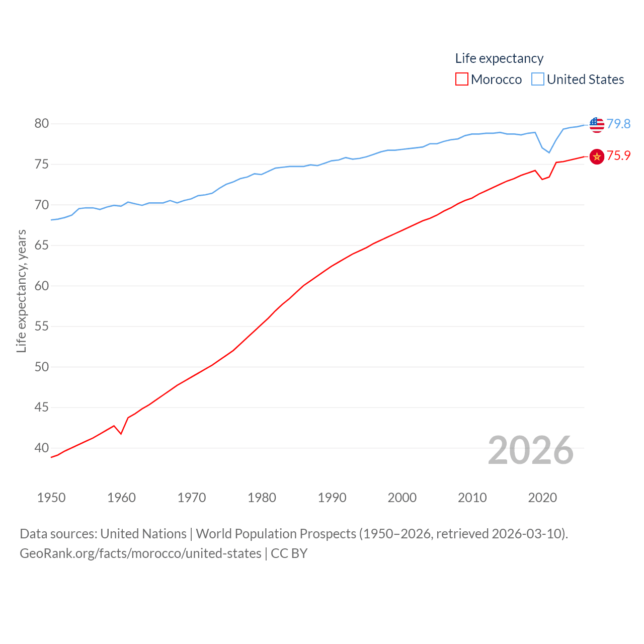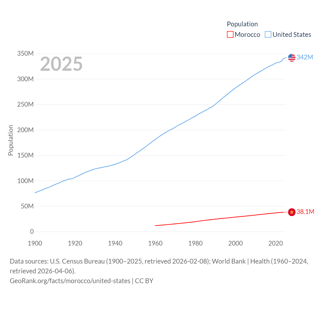 Morocco has a population of 38.1M (ranked 39/197), compared with 342M in The United States (ranked 3/197). Morocco's land area is 172,317 sq mi versus 3,531,839 sq mi for The United States (ranked 55th vs. 3rd).