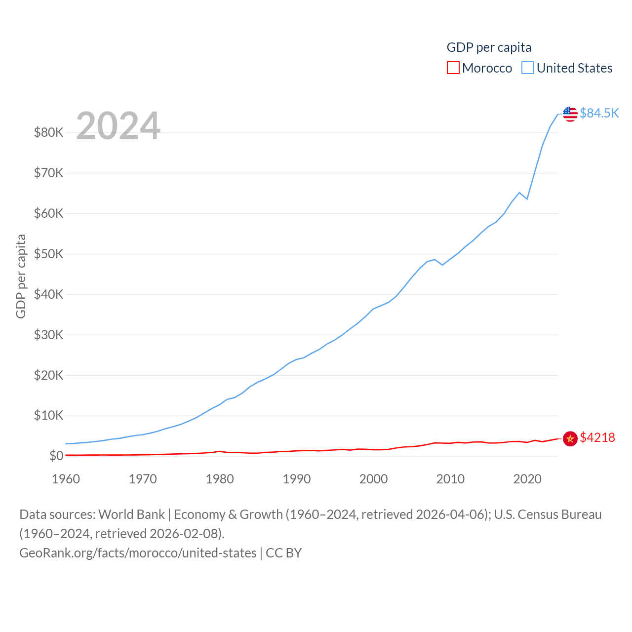 By GDP, Morocco ranks 58/197 ($161B) and The United States ranks 1/197 ($28.8T). By GDP per capita, Morocco ranks 127/197 ($4,218), while The United States ranks 10/197 ($84,534).
