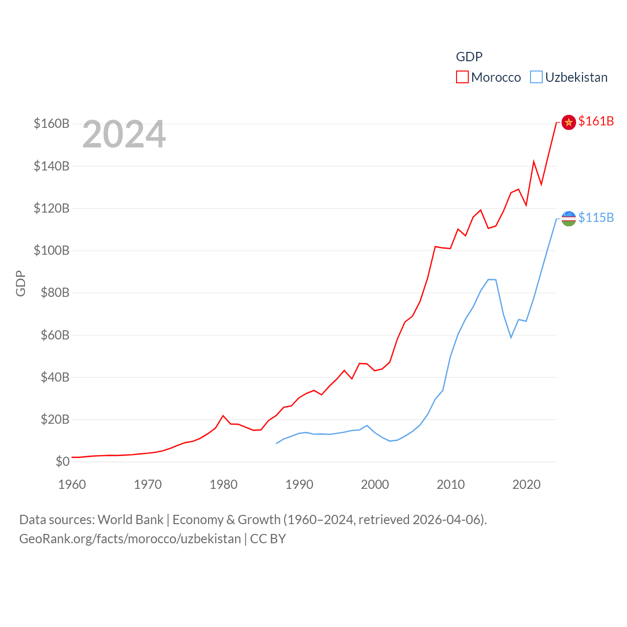 By GDP, Morocco ranks 58/197 ($161B) and Uzbekistan ranks 66/197 ($115B). By GDP per capita, Morocco ranks 127/197 ($4,218), while Uzbekistan ranks 139/197 ($3,162).
