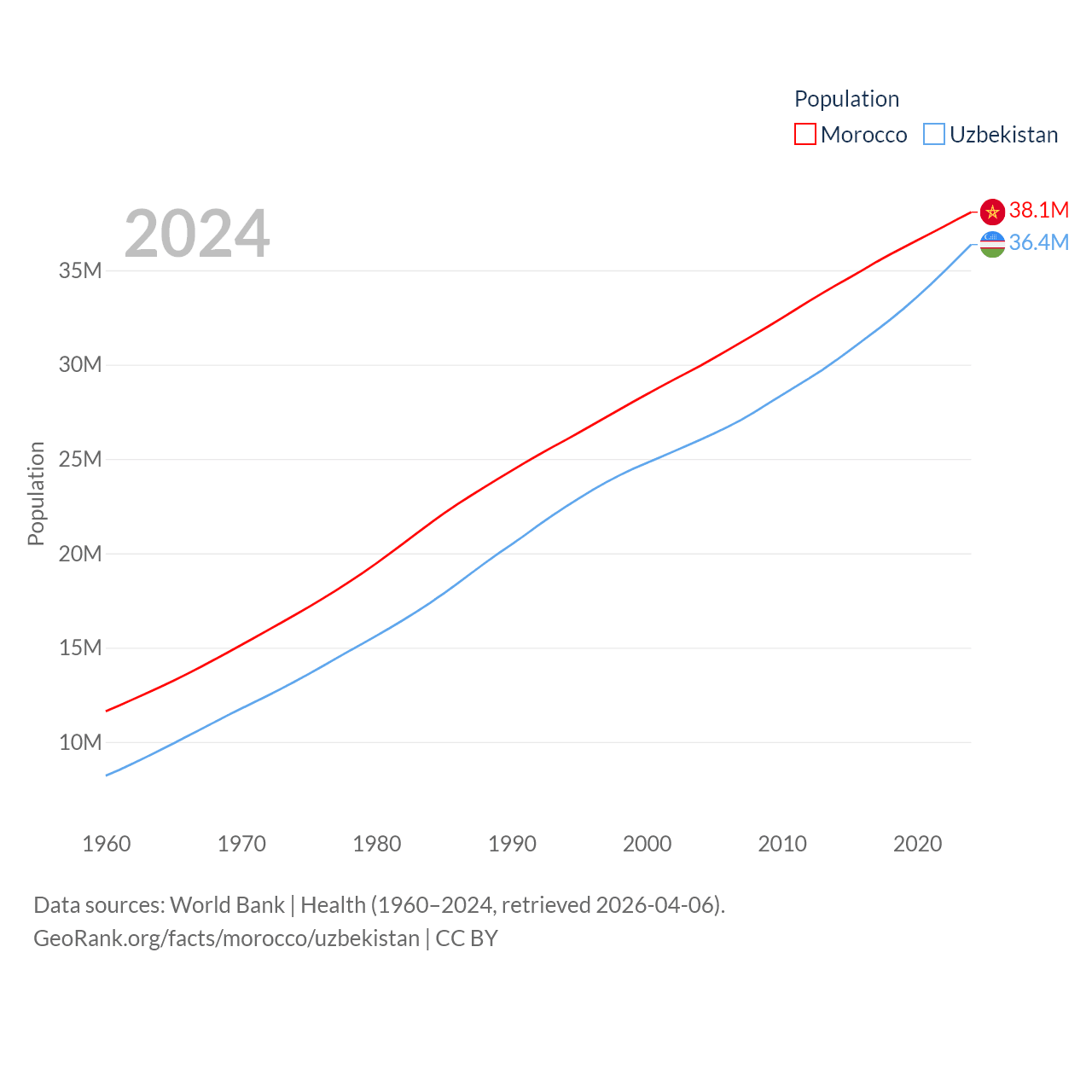 Morocco has a population of 38.1M (ranked 39/197), compared with 36.4M in Uzbekistan (ranked 43/197). Morocco's land area is 172,317 sq mi versus 170,136 sq mi for Uzbekistan (ranked 55th vs. 56th).