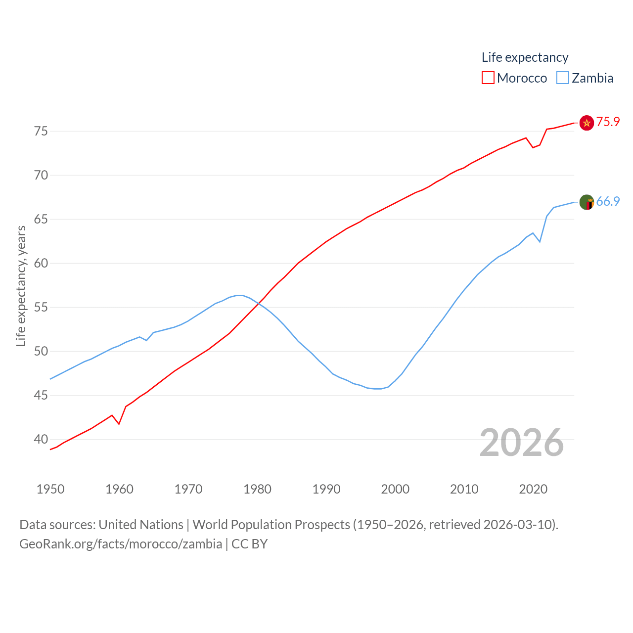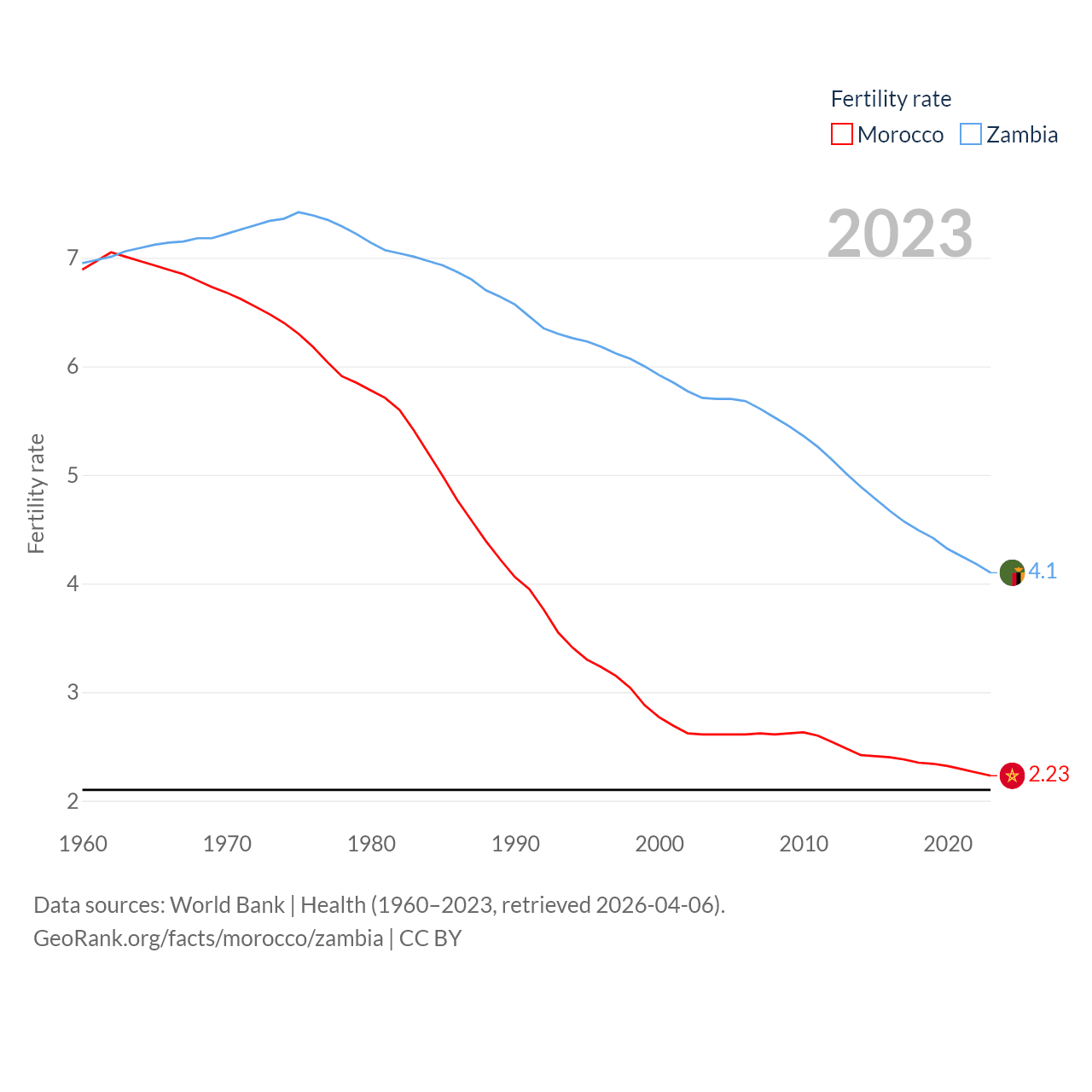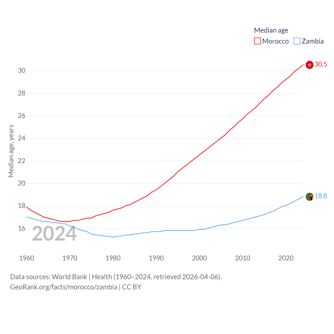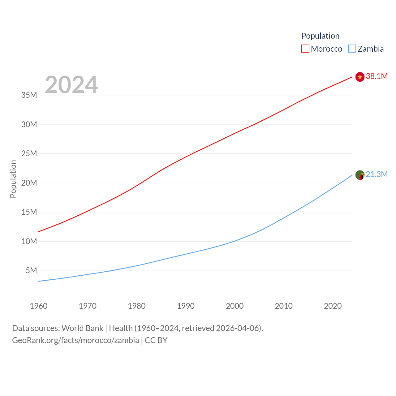 Morocco has a population of 38.1M (ranked 39/197), compared with 21.3M in Zambia (ranked 63/197). Morocco's land area is 172,317 sq mi versus 287,024 sq mi for Zambia (ranked 55th vs. 37th).