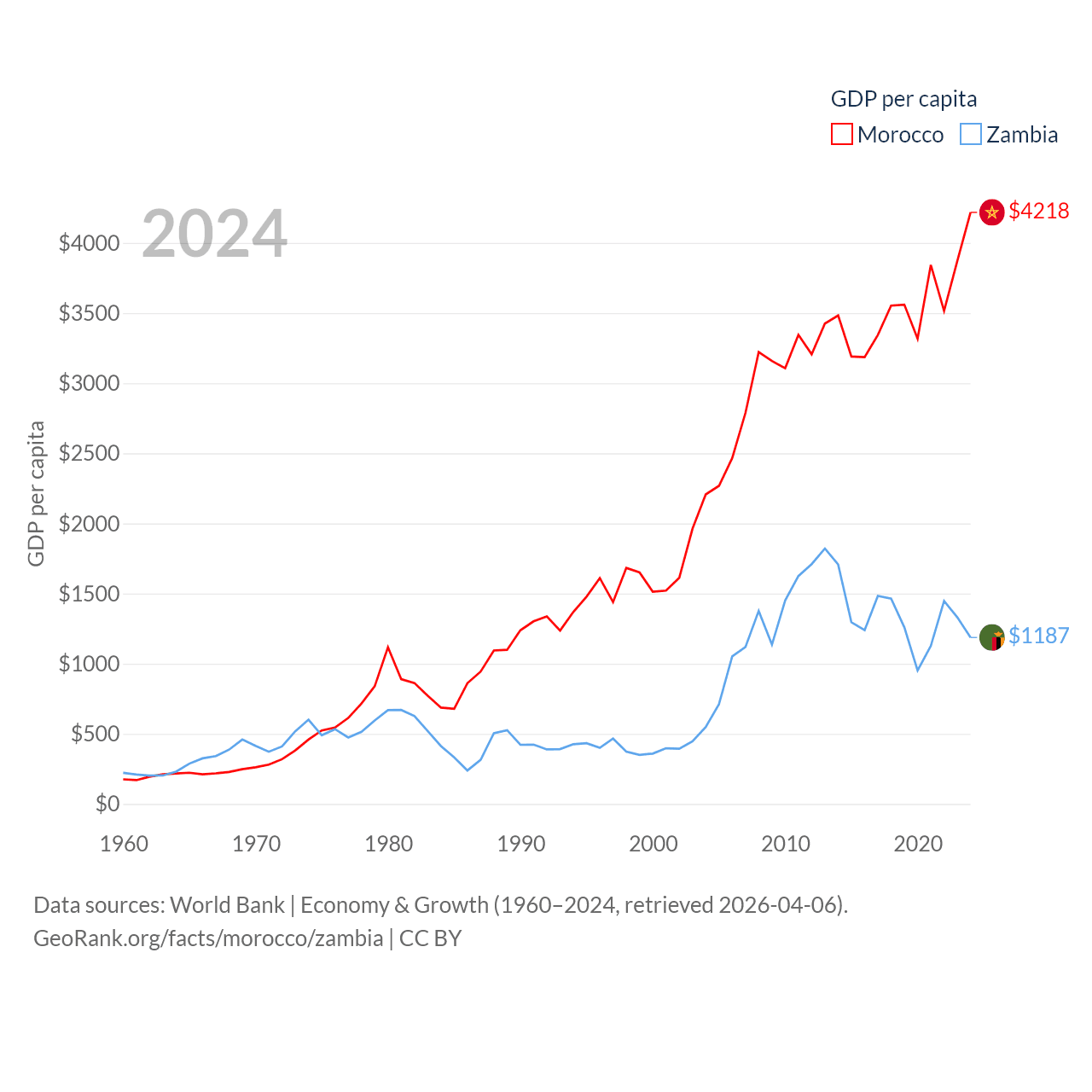By GDP, Morocco ranks 58/197 ($161B) and Zambia ranks 116/197 ($25.3B). By GDP per capita, Morocco ranks 127/197 ($4,218), while Zambia ranks 169/197 ($1,187).
