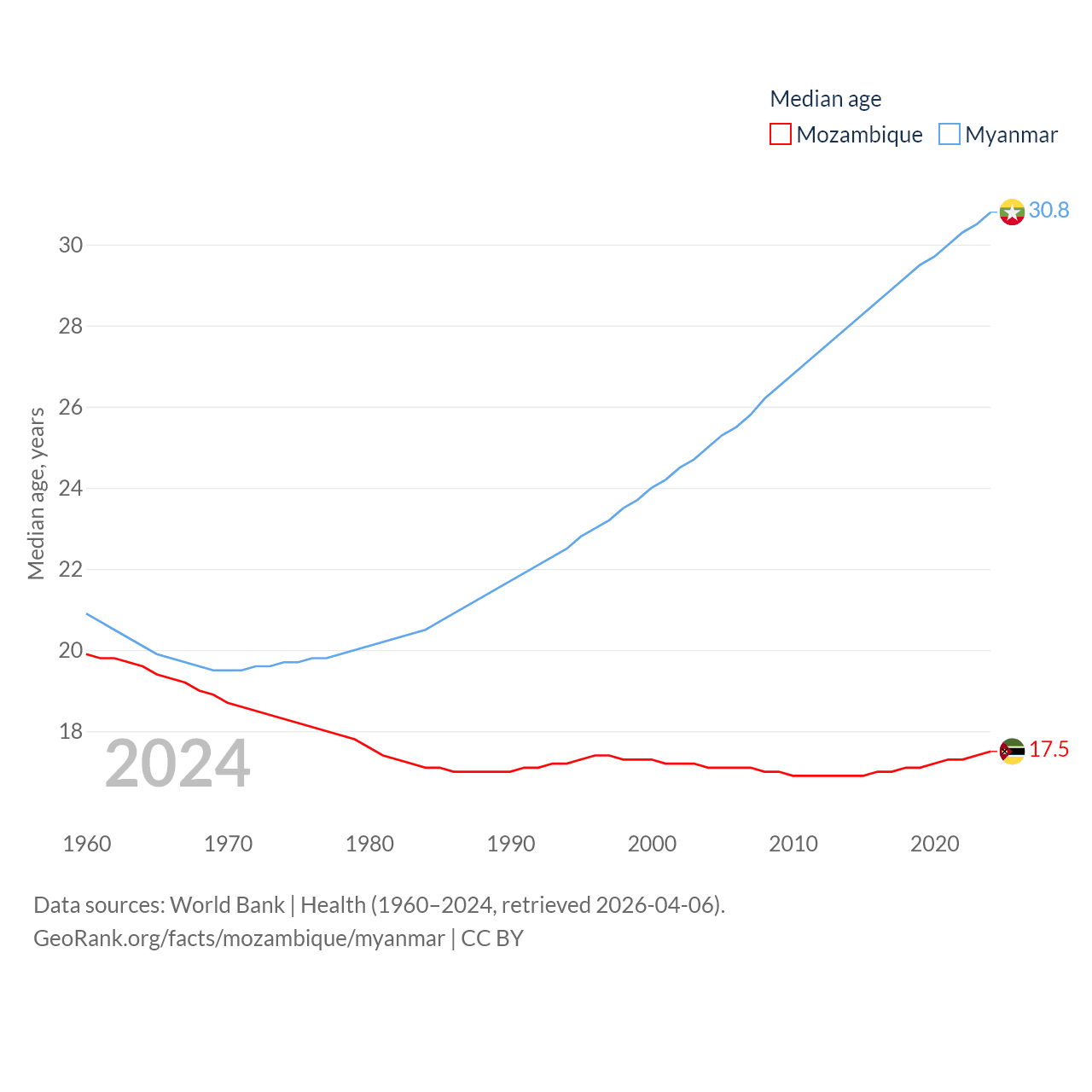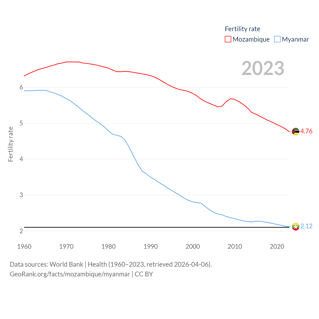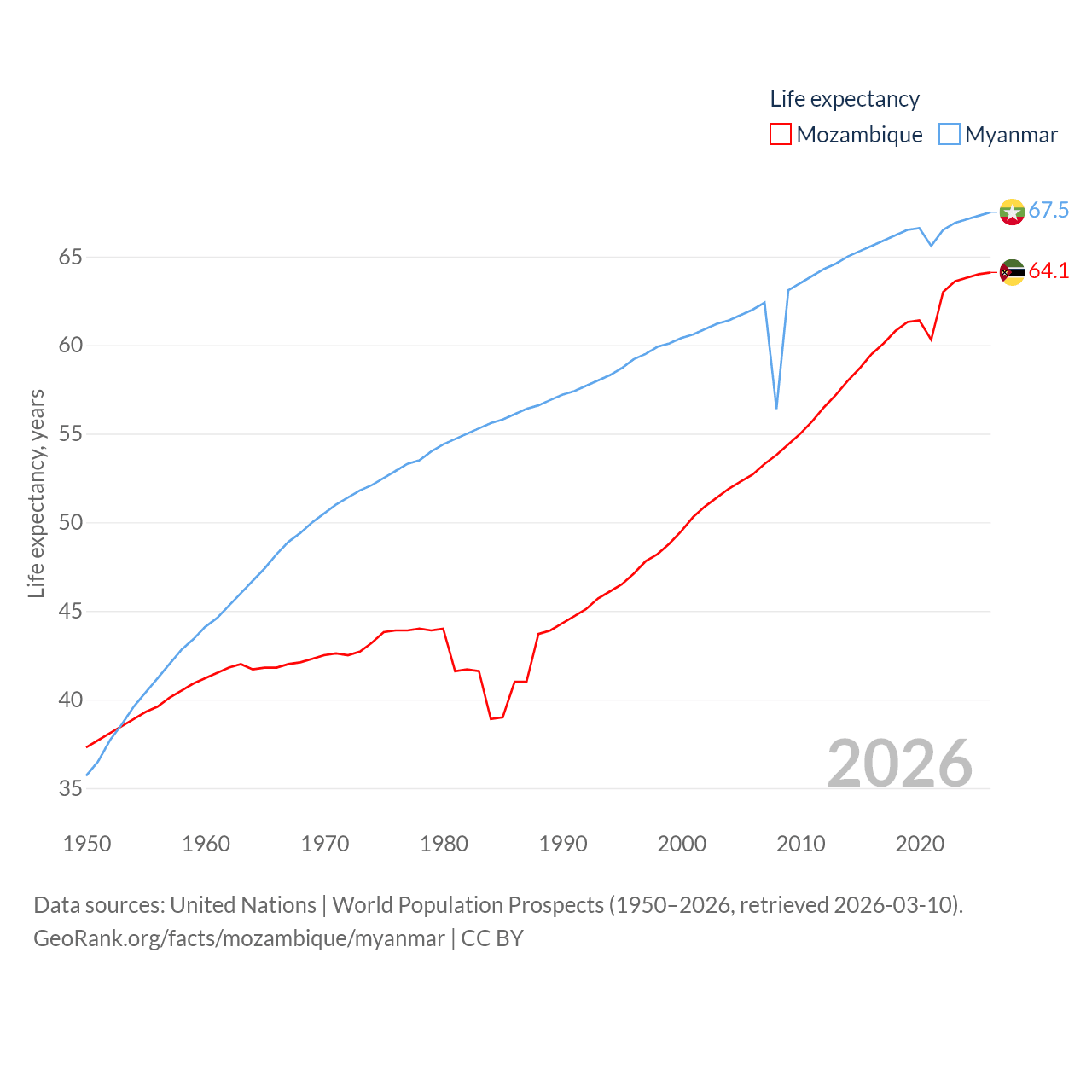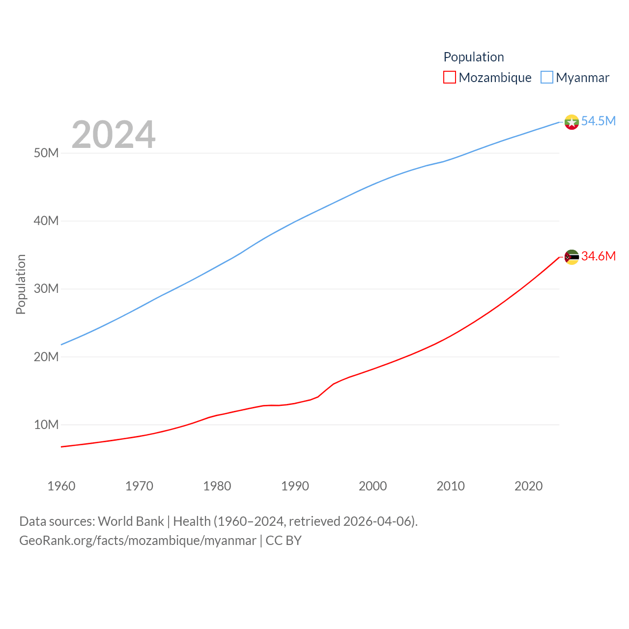 Mozambique has a population of 34.6M (ranked 46/197), compared with 54.5M in Myanmar (ranked 27/197). Mozambique's land area is 303,623 sq mi versus 251,997 sq mi for Myanmar (ranked 34th vs. 39th).