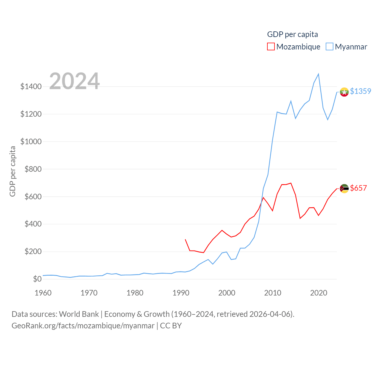 By GDP, Mozambique ranks 123/197 ($22.7B) and Myanmar ranks 85/197 ($74.1B). By GDP per capita, Mozambique ranks 189/197 ($657), while Myanmar ranks 165/197 ($1,359).