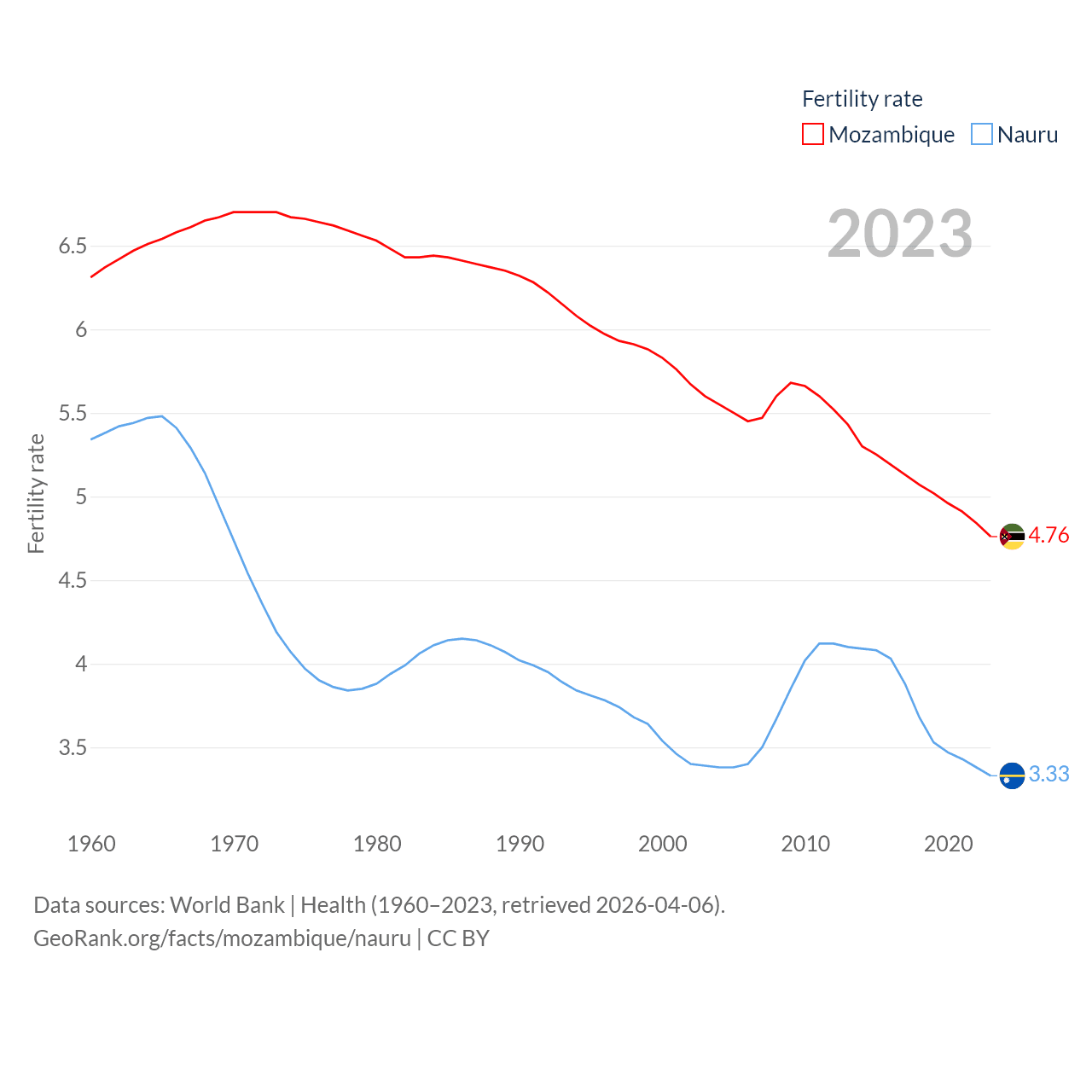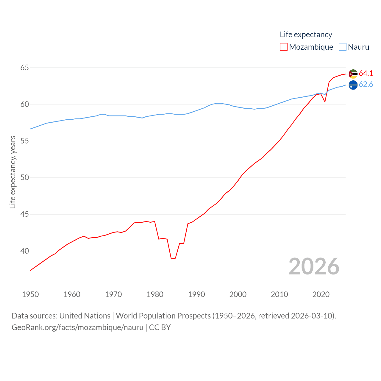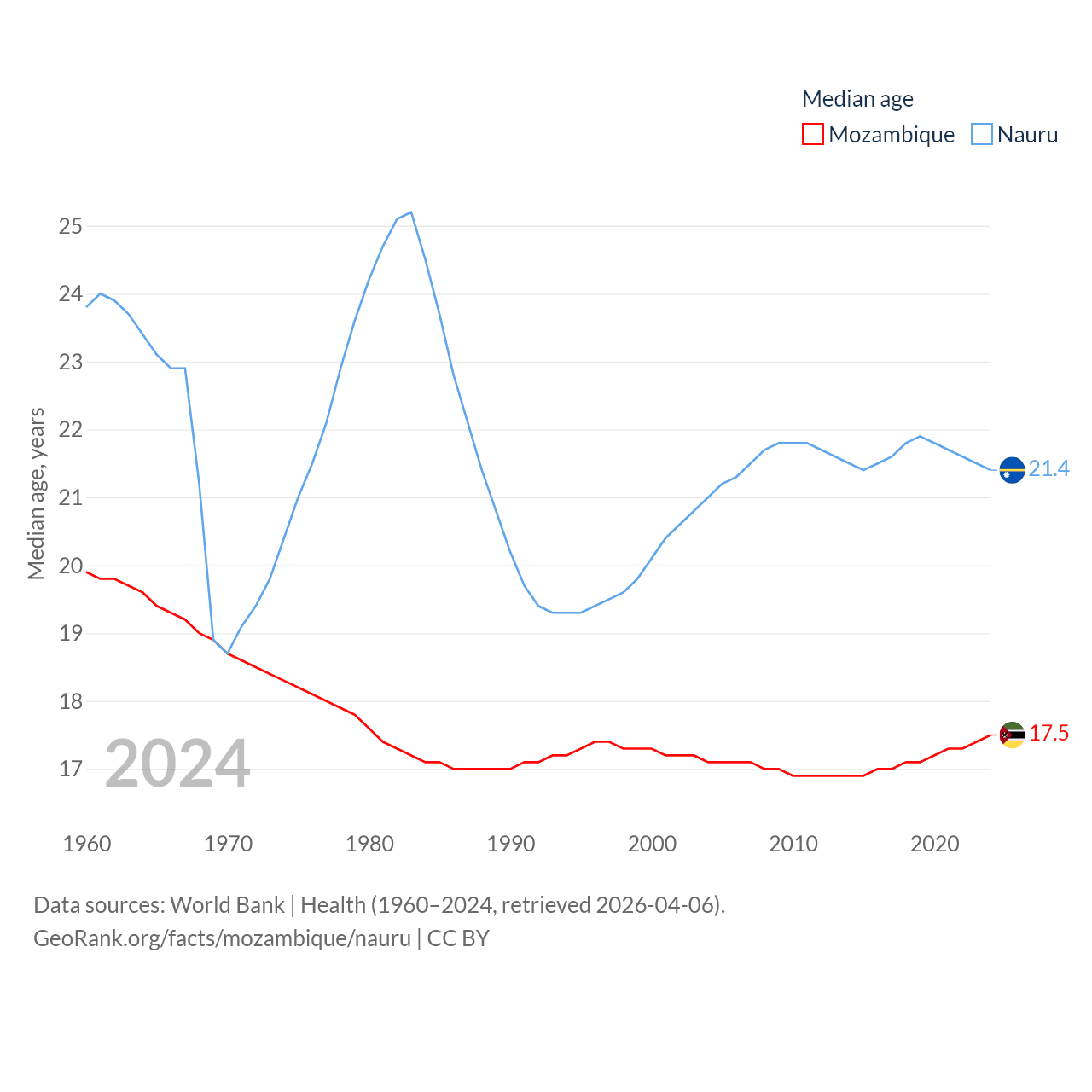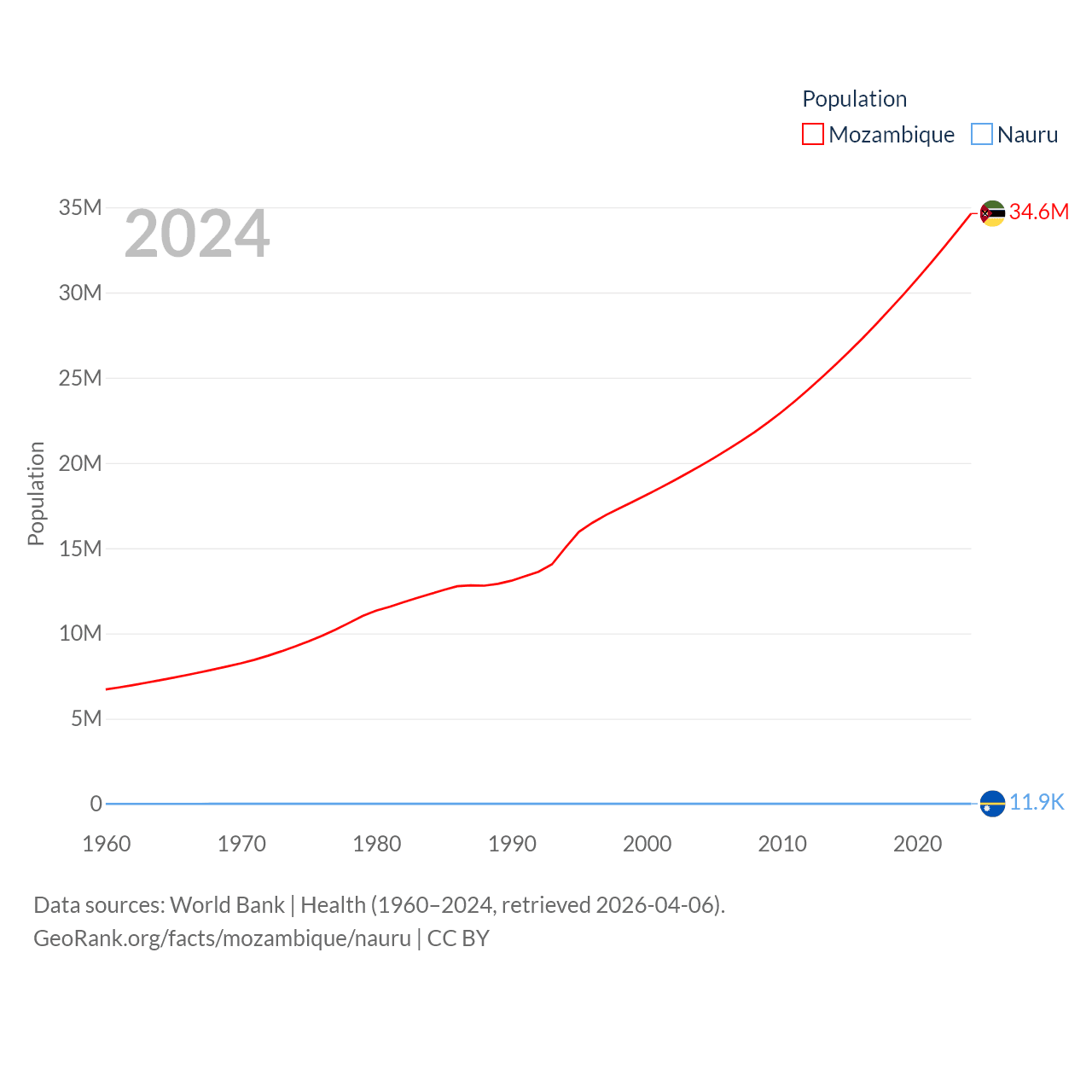 Mozambique has a population of 34.6M (ranked 46/197), compared with 11.9K in Nauru (ranked 195/197). Mozambique's land area is 303,623 sq mi versus 7.72 sq mi for Nauru (ranked 34th vs. 195th).
