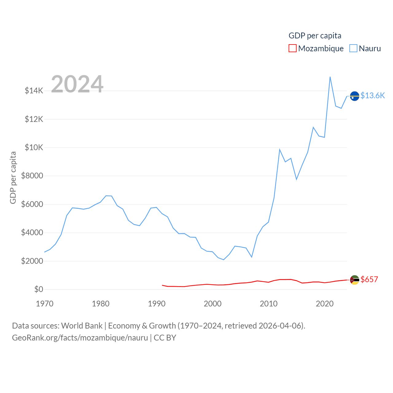 By GDP, Mozambique ranks 123/197 ($22.7B) and Nauru ranks 195/197 ($163M). By GDP per capita, Mozambique ranks 189/197 ($657), while Nauru ranks 74/197 ($13,609).