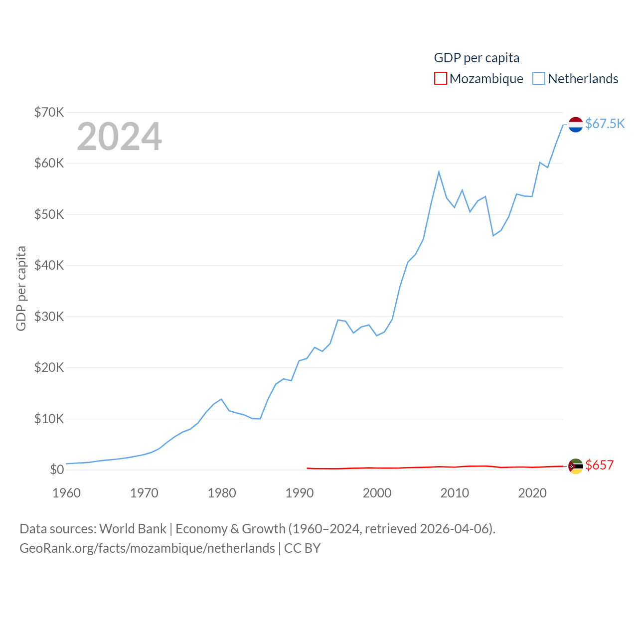 By GDP, Mozambique ranks 123/197 ($22.7B) and The Netherlands ranks 19/197 ($1.21T). By GDP per capita, Mozambique ranks 189/197 ($657), while The Netherlands ranks 13/197 ($67,520).