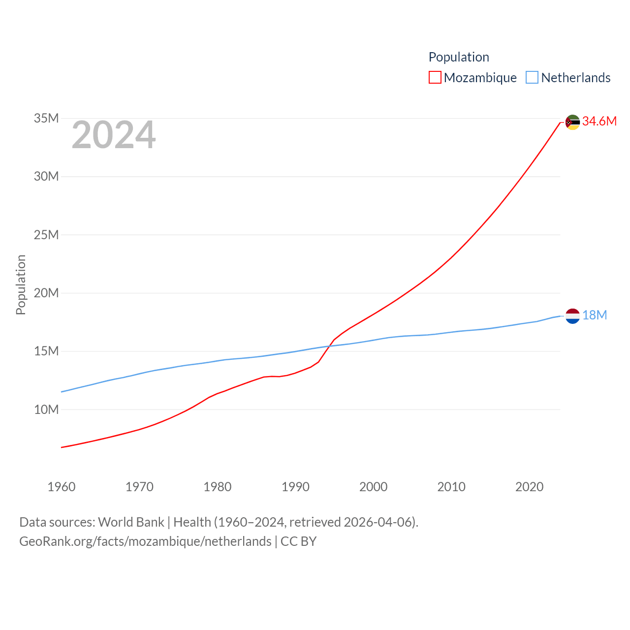 Mozambique has a population of 34.6M (ranked 46/197), compared with 18M in The Netherlands (ranked 72/197). Mozambique's land area is 303,623 sq mi versus 13,000 sq mi for The Netherlands (ranked 34th vs. 134th).
