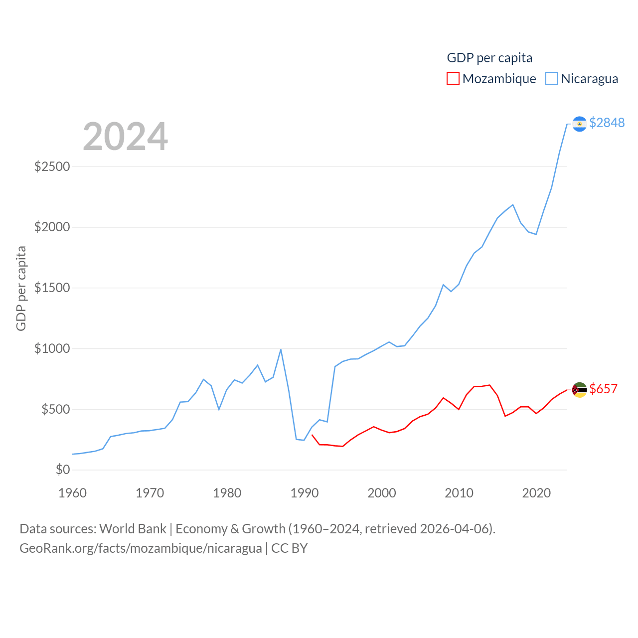 By GDP, Mozambique ranks 123/197 ($22.7B) and Nicaragua ranks 131/197 ($19.7B). By GDP per capita, Mozambique ranks 189/197 ($657), while Nicaragua ranks 141/197 ($2,848).