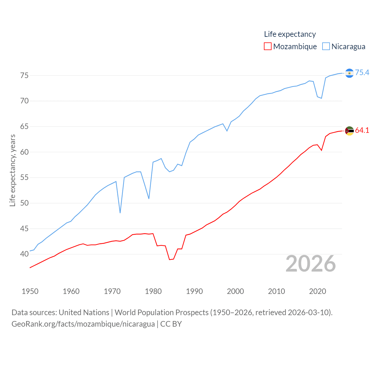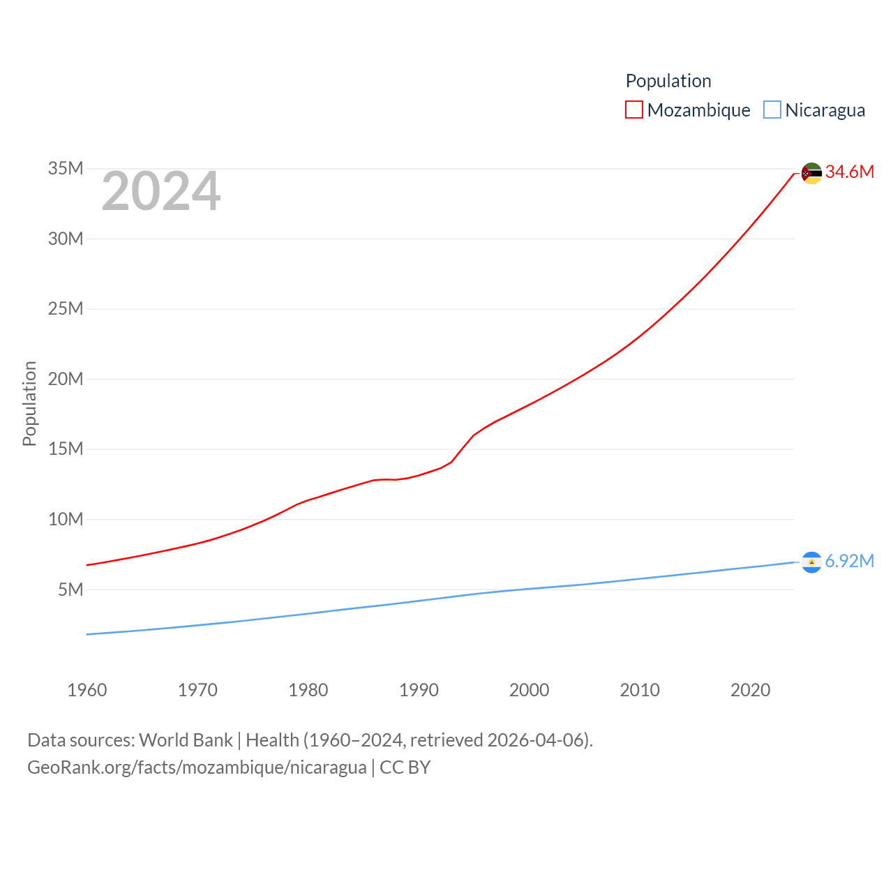 Mozambique has a population of 34.6M (ranked 46/197), compared with 6.92M in Nicaragua (ranked 108/197). Mozambique's land area is 303,623 sq mi versus 46,464 sq mi for Nicaragua (ranked 34th vs. 98th).