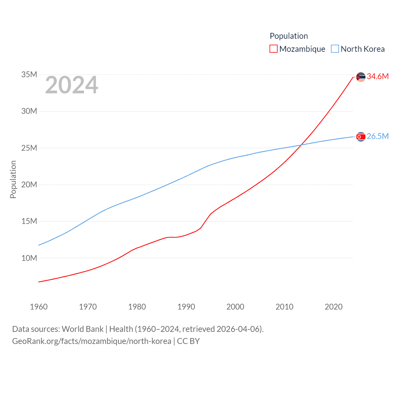 Mozambique has a population of 34.6M (ranked 46/197), compared with 26.5M in North Korea (ranked 56/197). Mozambique's land area is 303,623 sq mi versus 46,491 sq mi for North Korea (ranked 34th vs. 97th).