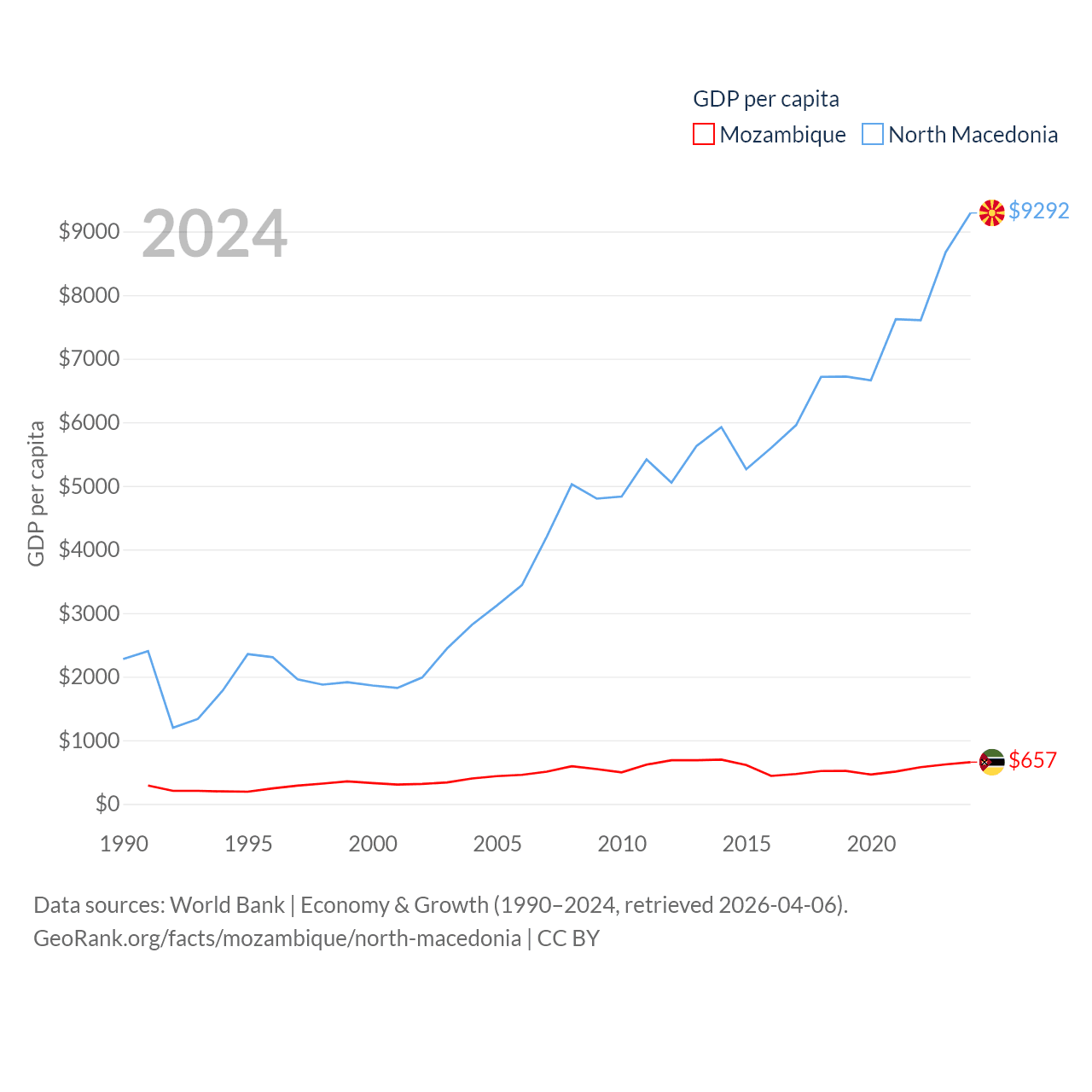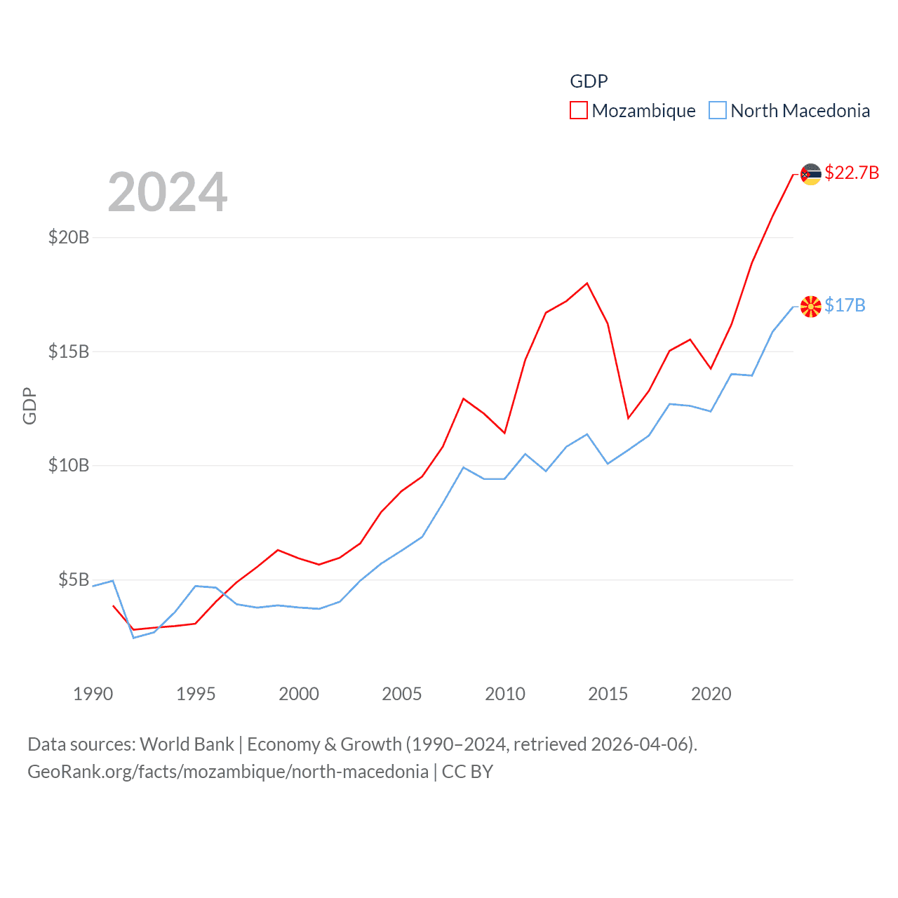 By GDP, Mozambique ranks 123/197 ($22.7B) and North Macedonia ranks 138/197 ($17B). By GDP per capita, Mozambique ranks 189/197 ($657), while North Macedonia ranks 88/197 ($9,292).