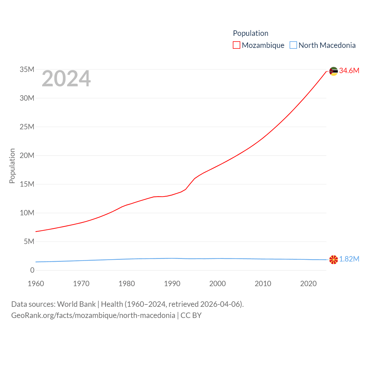 Mozambique has a population of 34.6M (ranked 46/197), compared with 1.82M in North Macedonia (ranked 150/197). Mozambique's land area is 303,623 sq mi versus 9,737 sq mi for North Macedonia (ranked 34th vs. 145th).