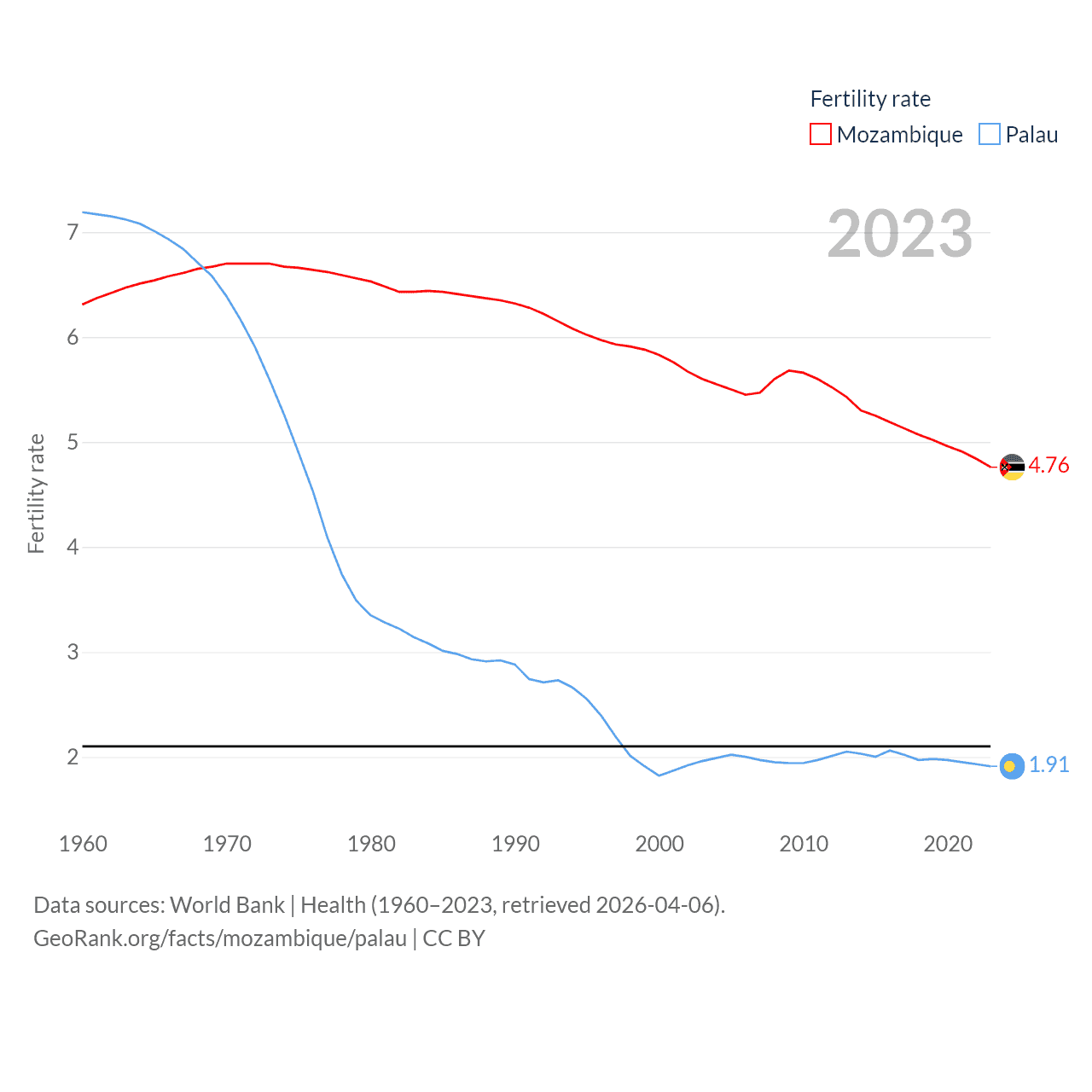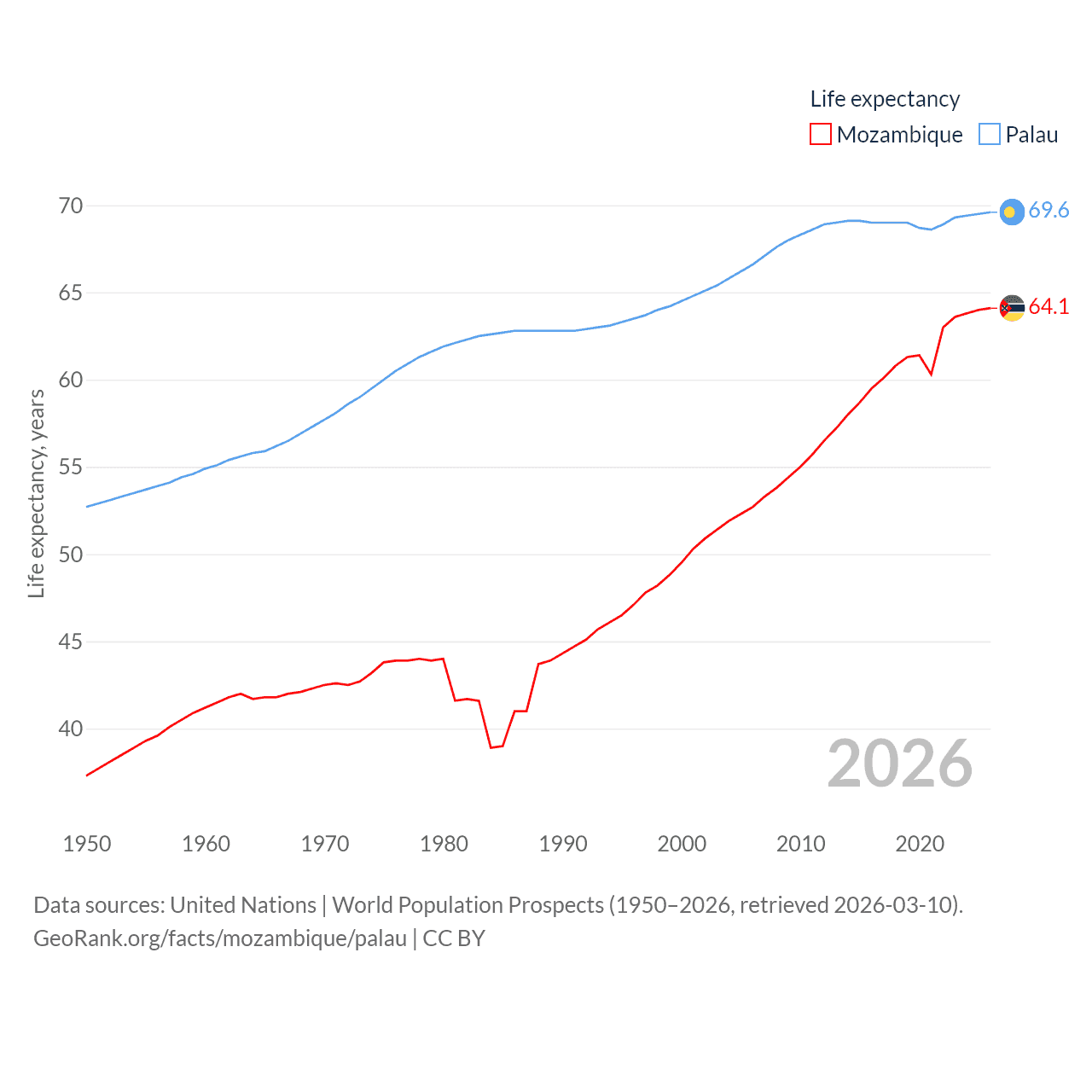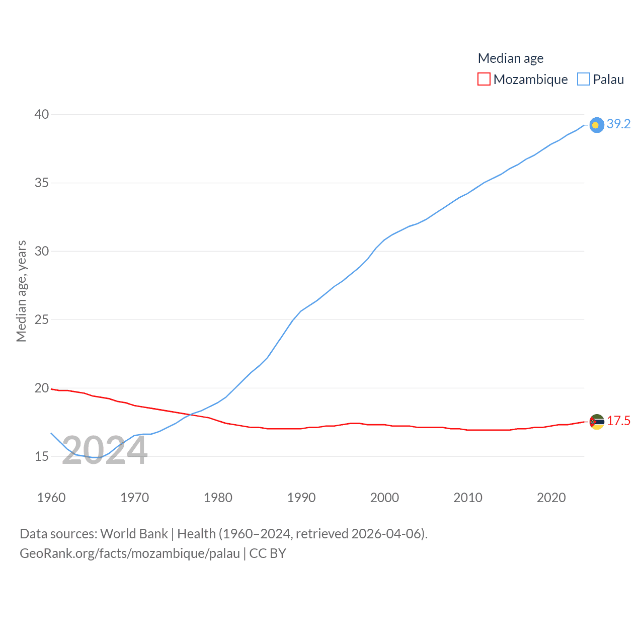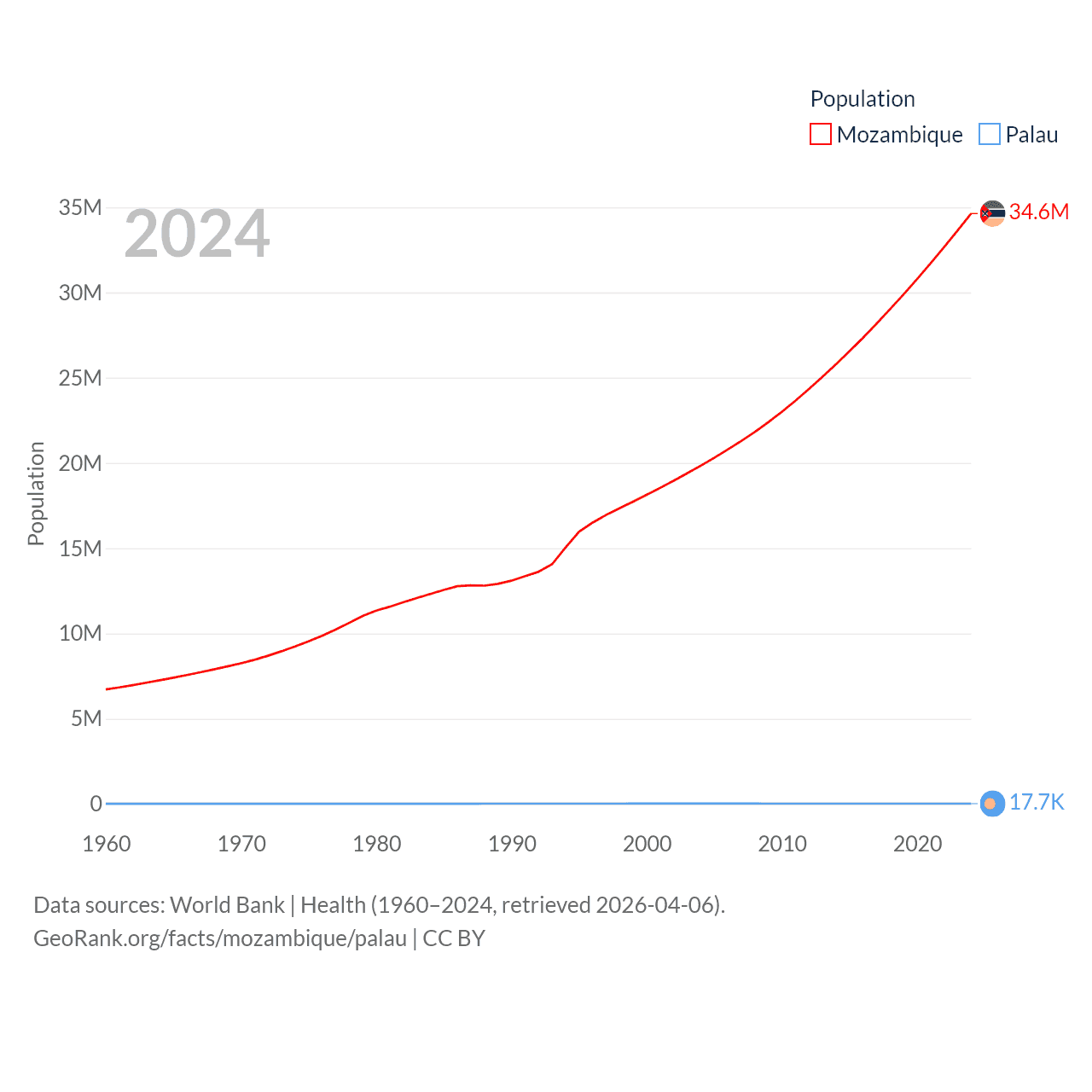 Mozambique has a population of 34.6M (ranked 46/197), compared with 17.7K in Palau (ranked 194/197). Mozambique's land area is 303,623 sq mi versus 177.6 sq mi for Palau (ranked 34th vs. 180th).