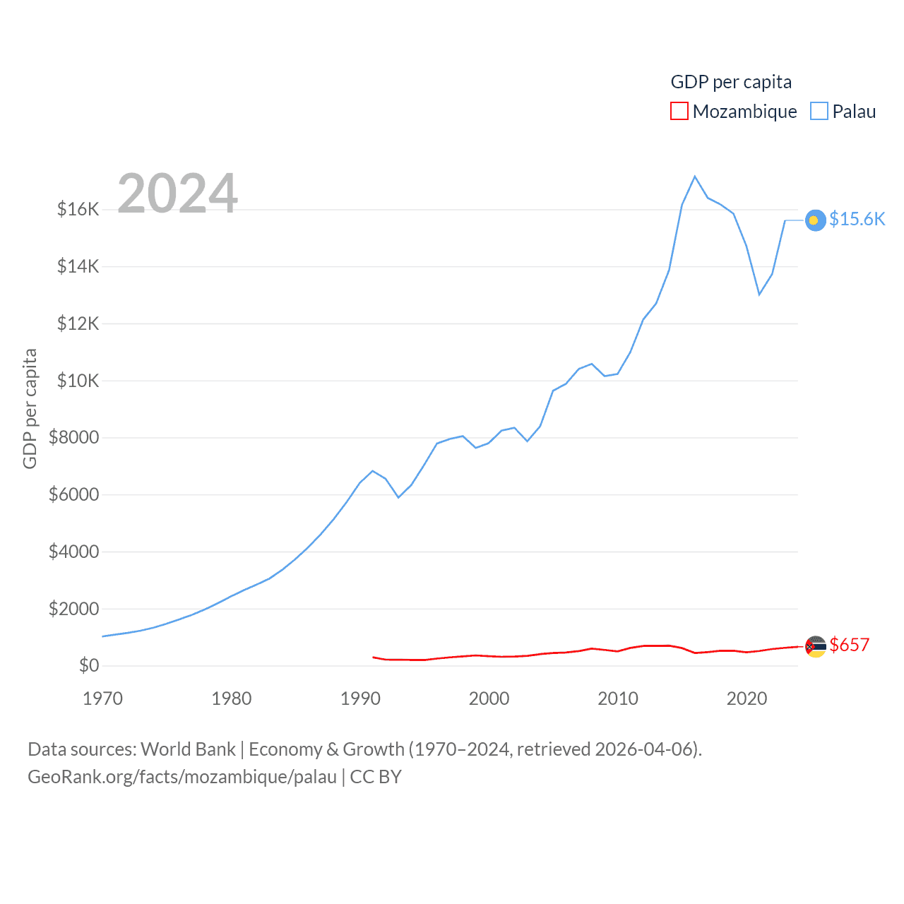 By GDP, Mozambique ranks 123/197 ($22.7B) and Palau ranks 194/197 ($277M). By GDP per capita, Mozambique ranks 189/197 ($657), while Palau ranks 67/197 ($15,611).