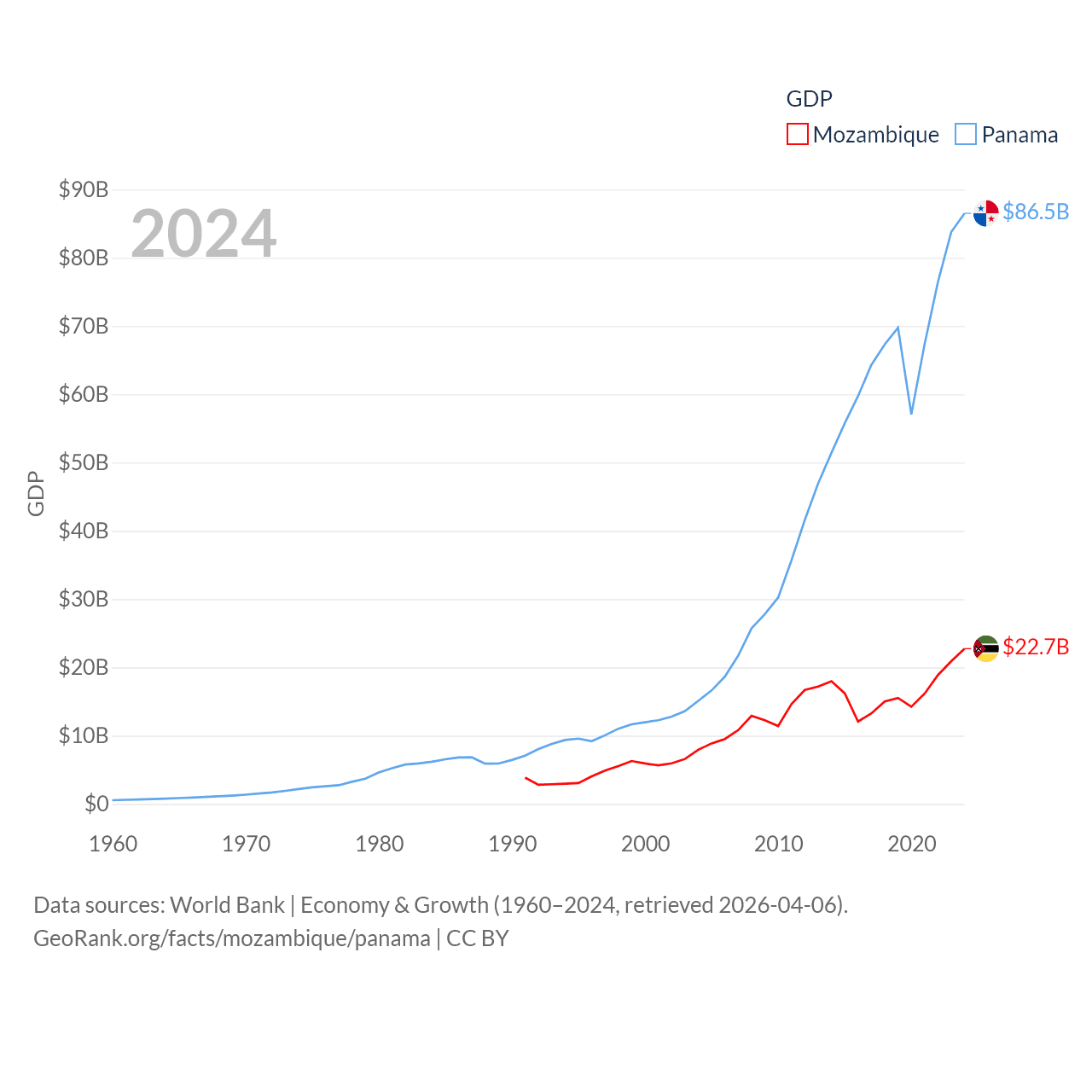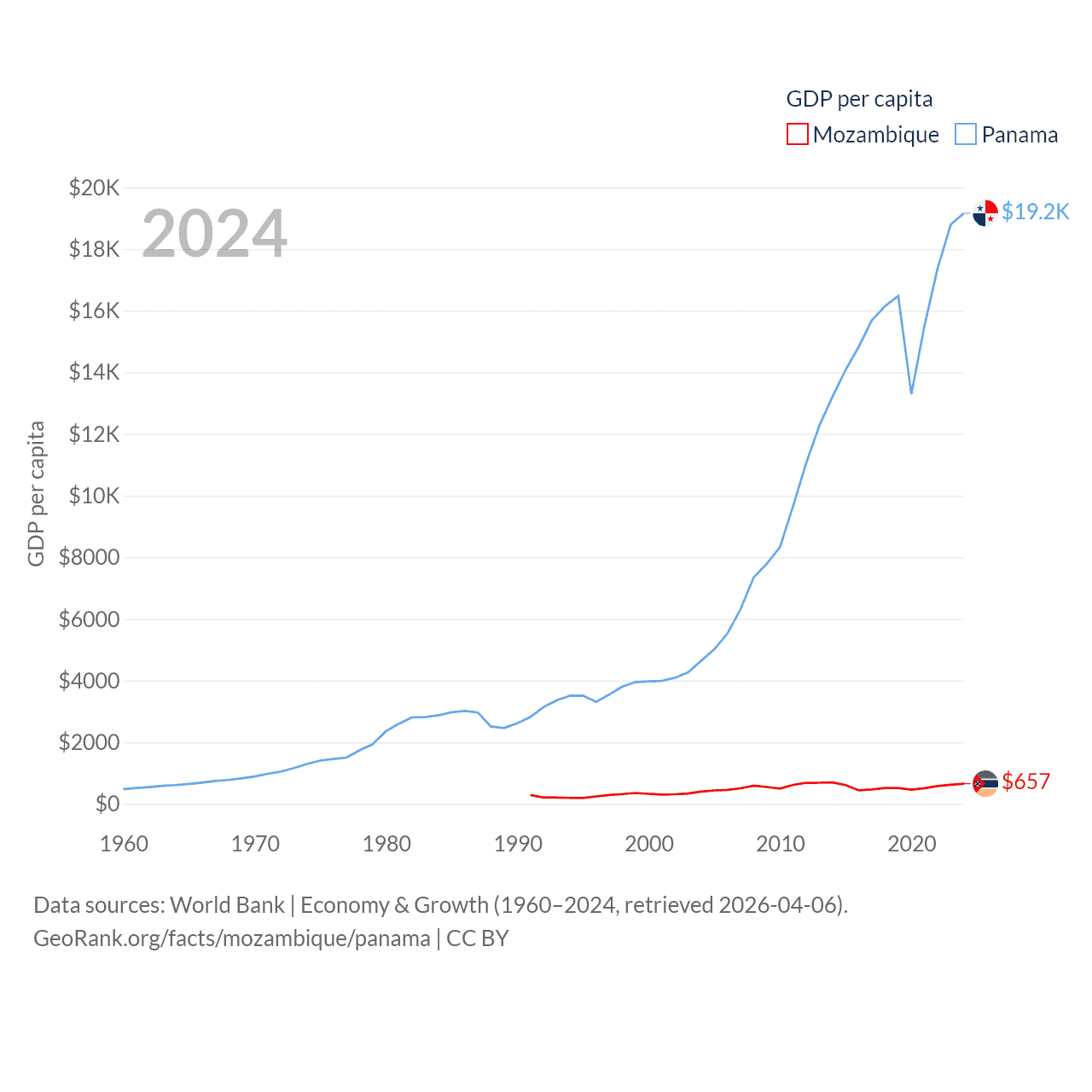 By GDP, Mozambique ranks 123/197 ($22.7B) and Panama ranks 78/197 ($86.5B). By GDP per capita, Mozambique ranks 189/197 ($657), while Panama ranks 60/197 ($19,161).
