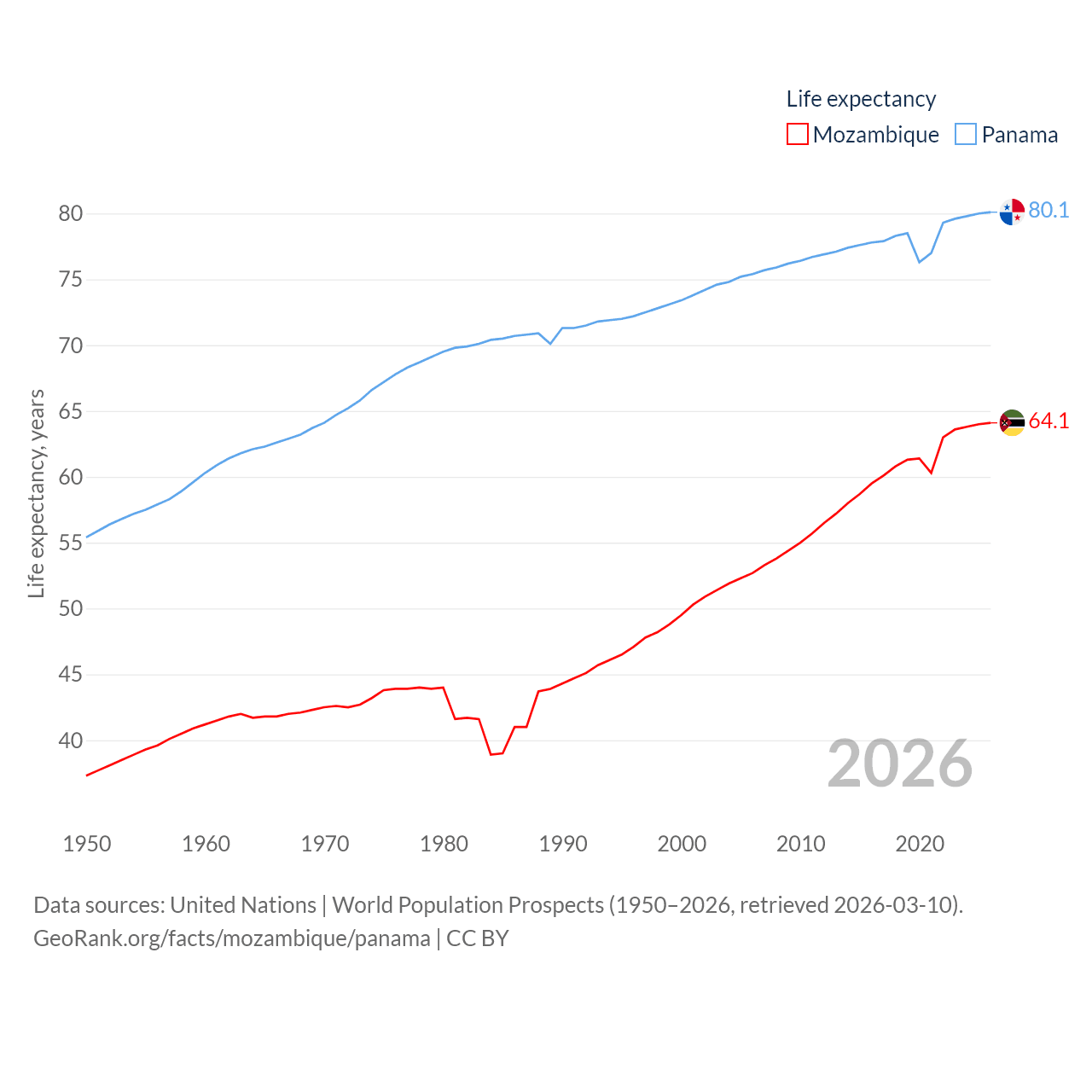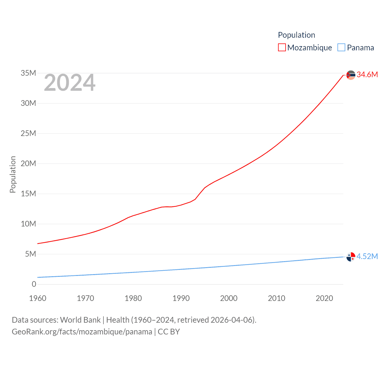 Mozambique has a population of 34.6M (ranked 46/197), compared with 4.52M in Panama (ranked 128/197). Mozambique's land area is 303,623 sq mi versus 28,641 sq mi for Panama (ranked 34th vs. 115th).