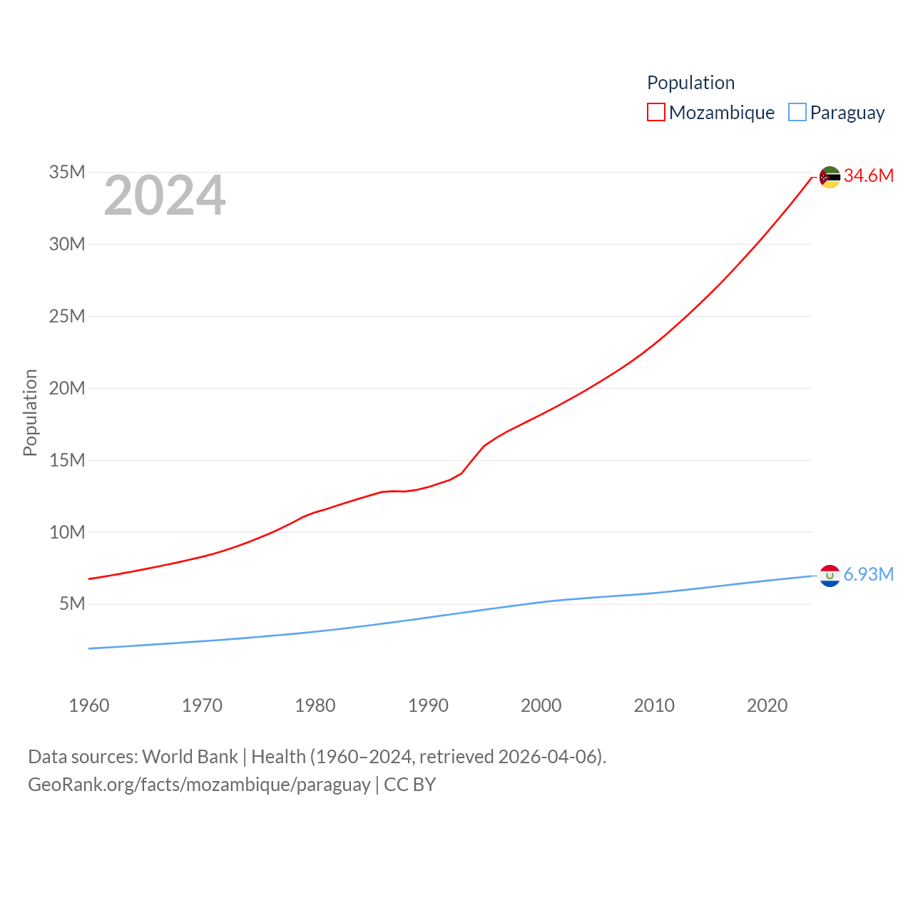 Mozambique has a population of 34.6M (ranked 46/197), compared with 6.93M in Paraguay (ranked 107/197). Mozambique's land area is 303,623 sq mi versus 152,901 sq mi for Paraguay (ranked 34th vs. 59th).