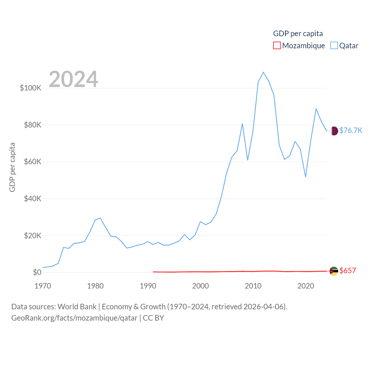 By GDP, Mozambique ranks 123/197 ($22.7B) and Qatar ranks 56/197 ($219B). By GDP per capita, Mozambique ranks 189/197 ($657), while Qatar ranks 11/197 ($76,689).