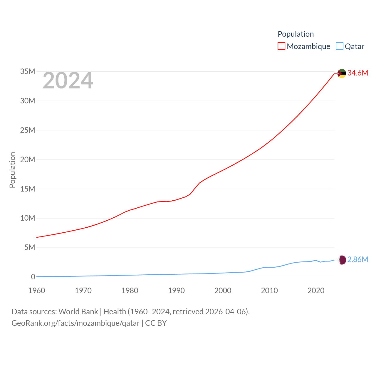 Mozambique has a population of 34.6M (ranked 46/197), compared with 2.86M in Qatar (ranked 138/197). Mozambique's land area is 303,623 sq mi versus 4,436 sq mi for Qatar (ranked 34th vs. 158th).