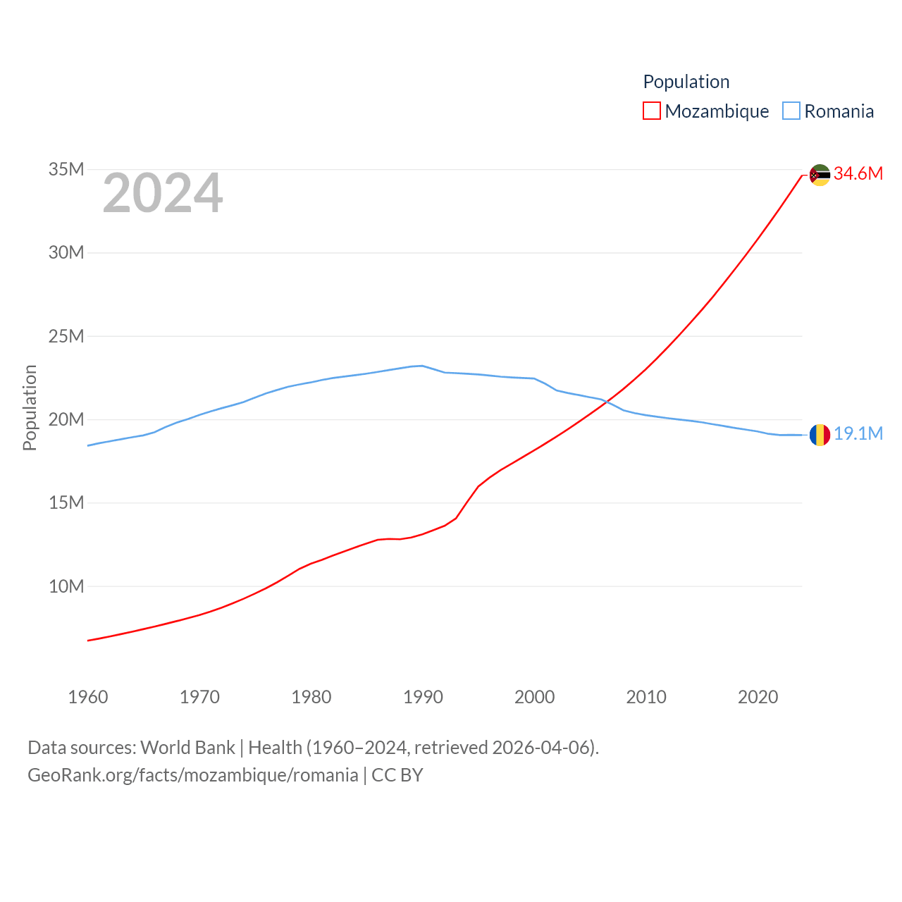 Mozambique has a population of 34.6M (ranked 46/197), compared with 19.1M in Romania (ranked 67/197). Mozambique's land area is 303,623 sq mi versus 88,834 sq mi for Romania (ranked 34th vs. 80th).