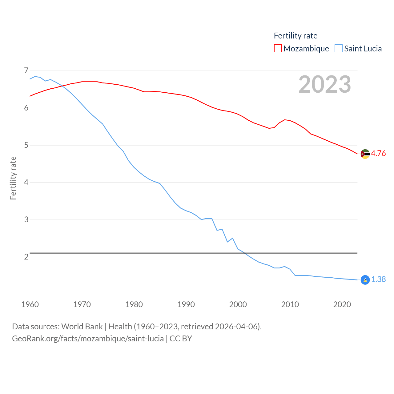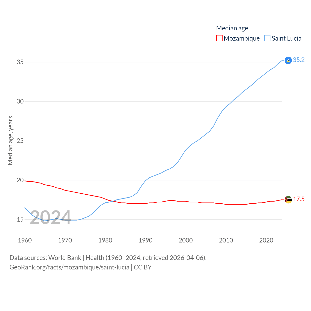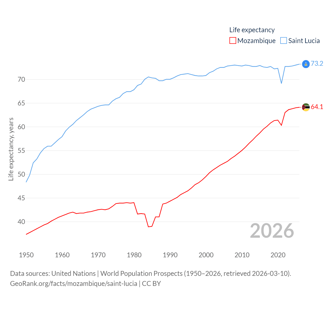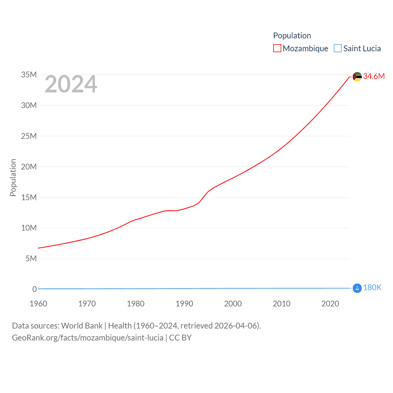 Mozambique has a population of 34.6M (ranked 46/197), compared with 180K in Saint Lucia (ranked 178/197). Mozambique's land area is 303,623 sq mi versus 235.5 sq mi for Saint Lucia (ranked 34th vs. 178th).