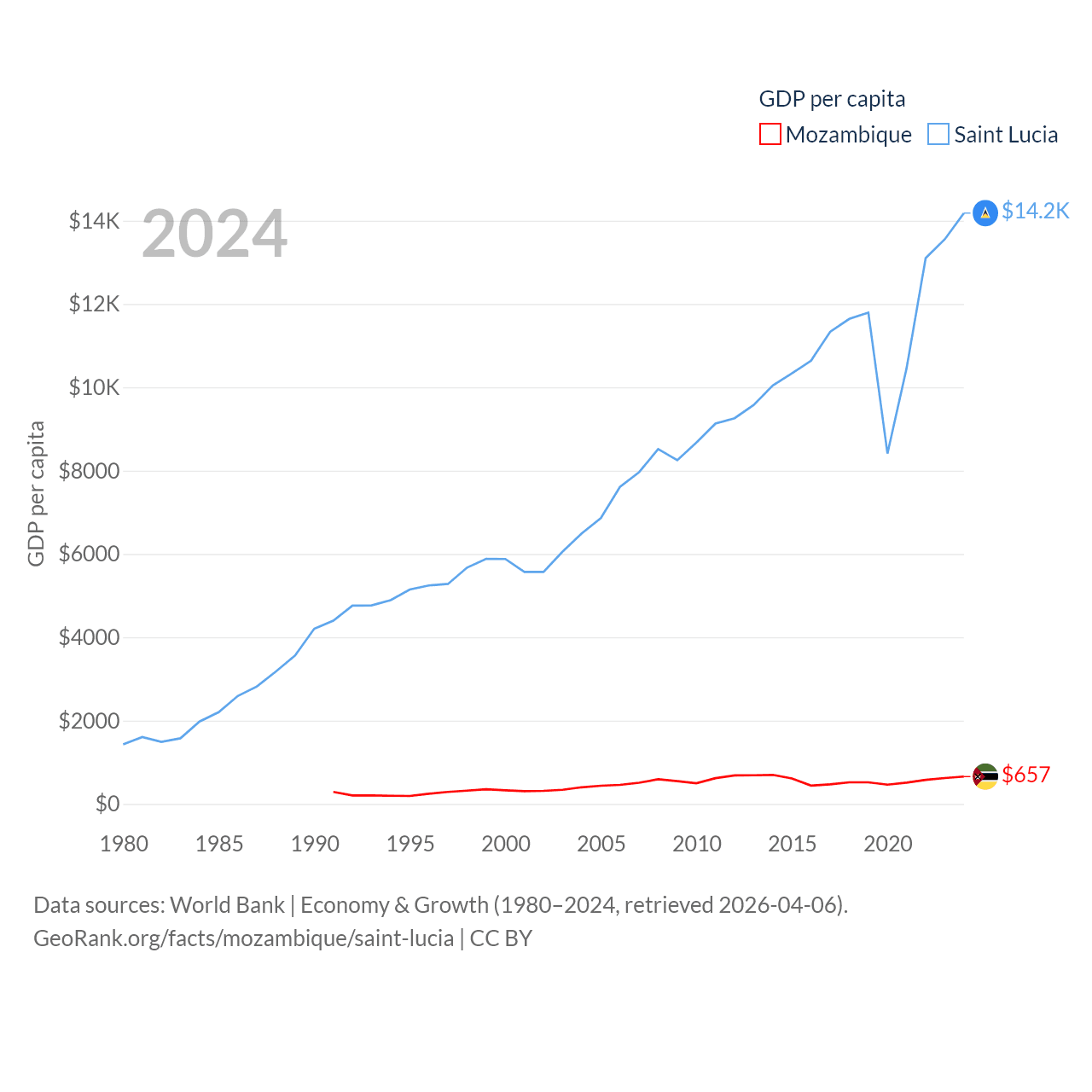 By GDP, Mozambique ranks 123/197 ($22.7B) and Saint Lucia ranks 173/197 ($2.55B). By GDP per capita, Mozambique ranks 189/197 ($657), while Saint Lucia ranks 70/197 ($14,182).