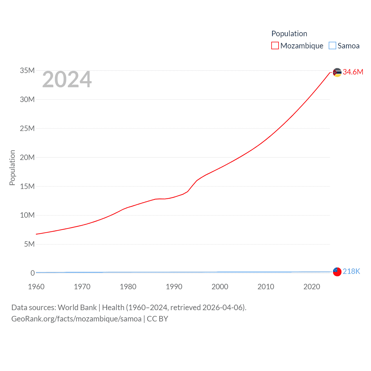 Mozambique has a population of 34.6M (ranked 46/197), compared with 218K in Samoa (ranked 177/197). Mozambique's land area is 303,623 sq mi versus 1,073 sq mi for Samoa (ranked 34th vs. 168th).