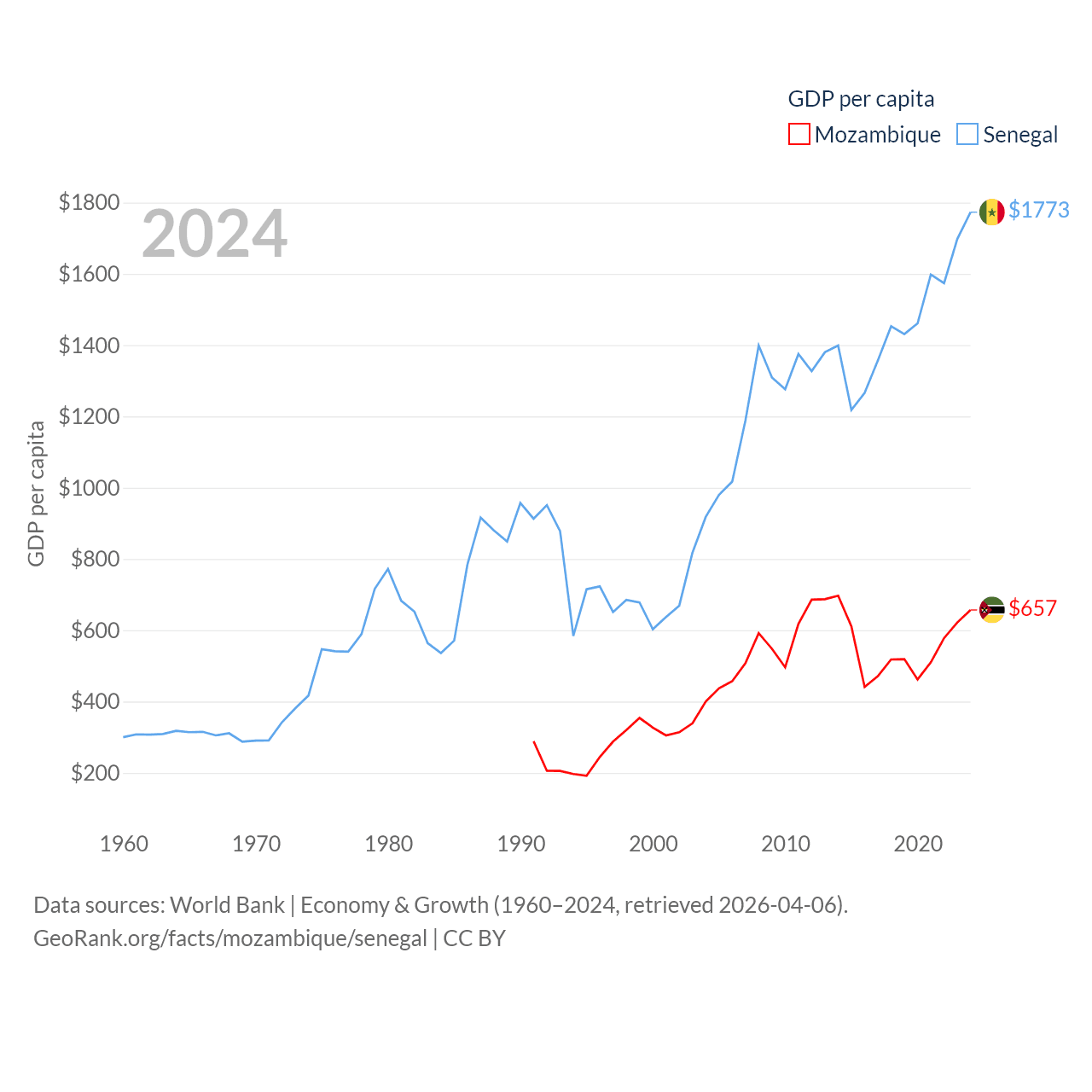 By GDP, Mozambique ranks 123/197 ($22.7B) and Senegal ranks 109/197 ($32.8B). By GDP per capita, Mozambique ranks 189/197 ($657), while Senegal ranks 159/197 ($1,773).