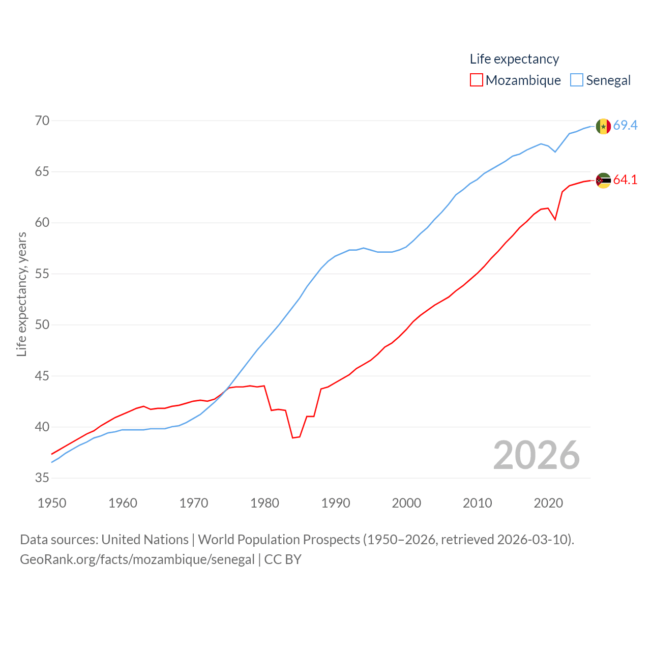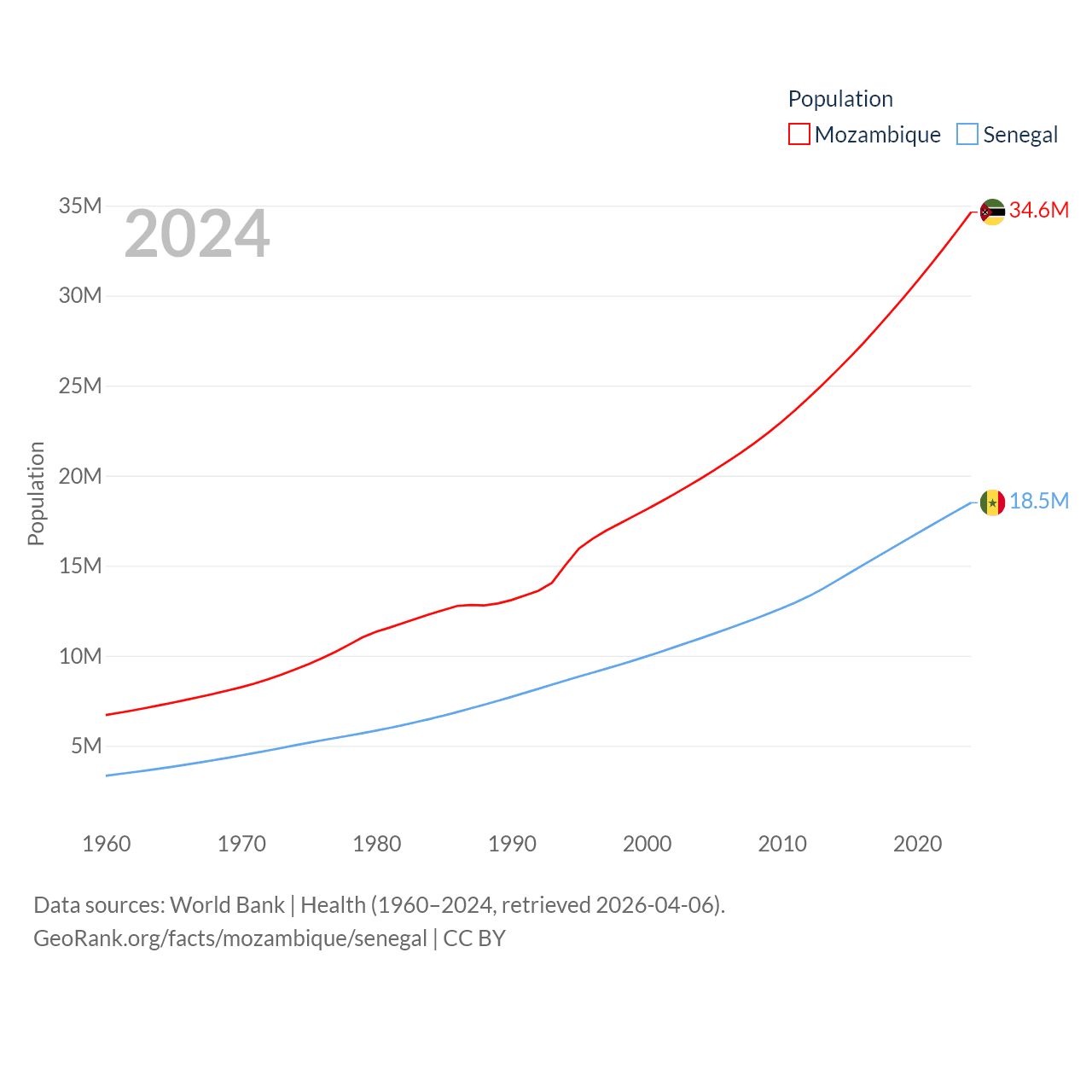 Mozambique has a population of 34.6M (ranked 46/197), compared with 18.5M in Senegal (ranked 69/197). Mozambique's land area is 303,623 sq mi versus 74,336 sq mi for Senegal (ranked 34th vs. 85th).