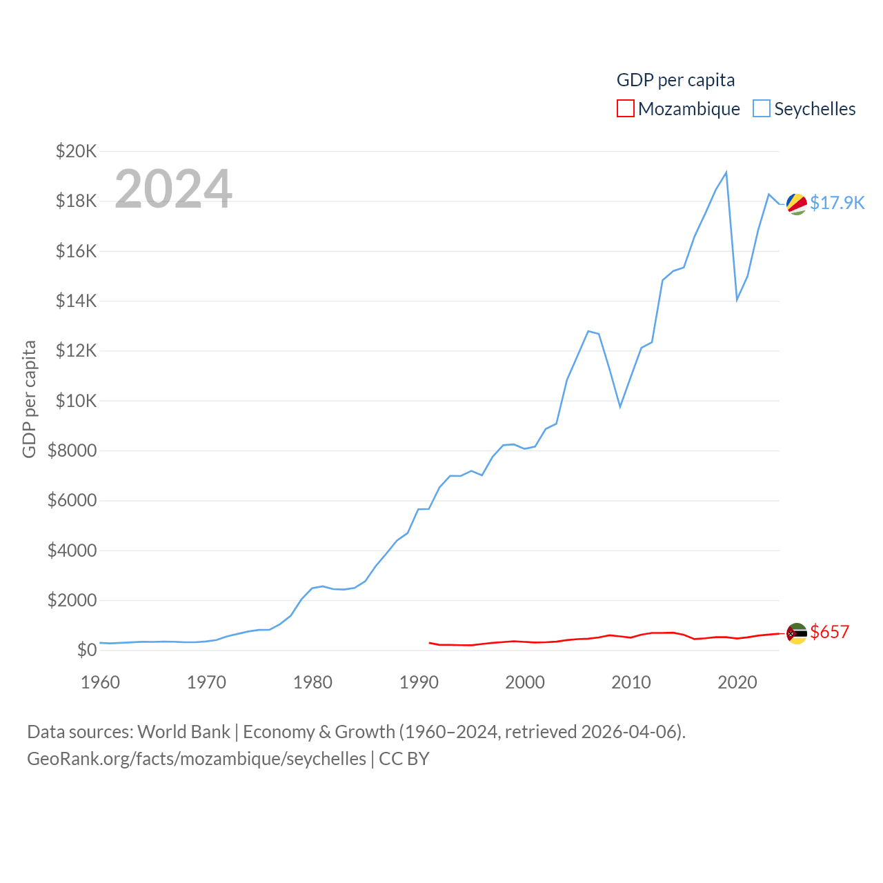 By GDP, Mozambique ranks 123/197 ($22.7B) and The Seychelles ranks 178/197 ($2.17B). By GDP per capita, Mozambique ranks 189/197 ($657), while The Seychelles ranks 63/197 ($17,859).