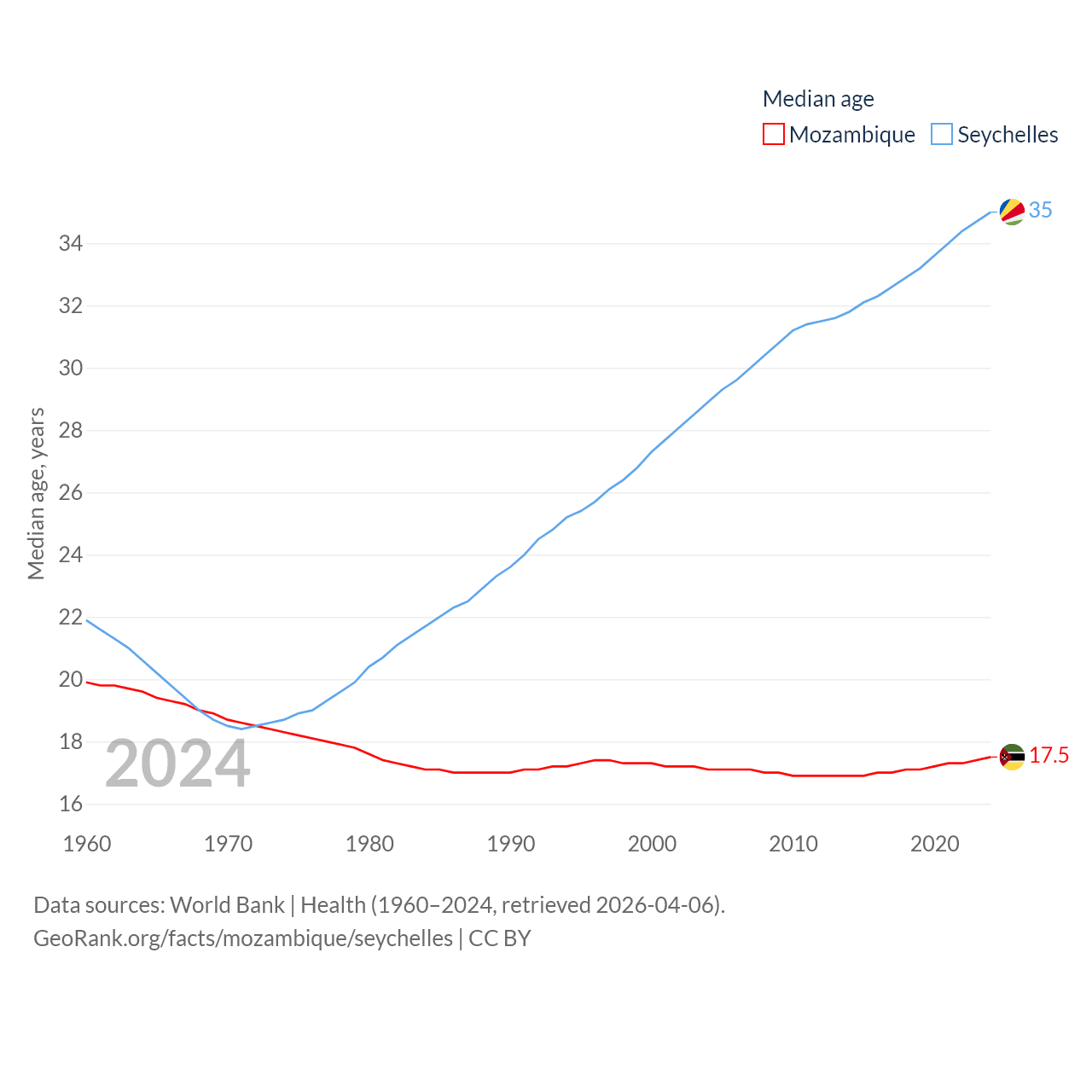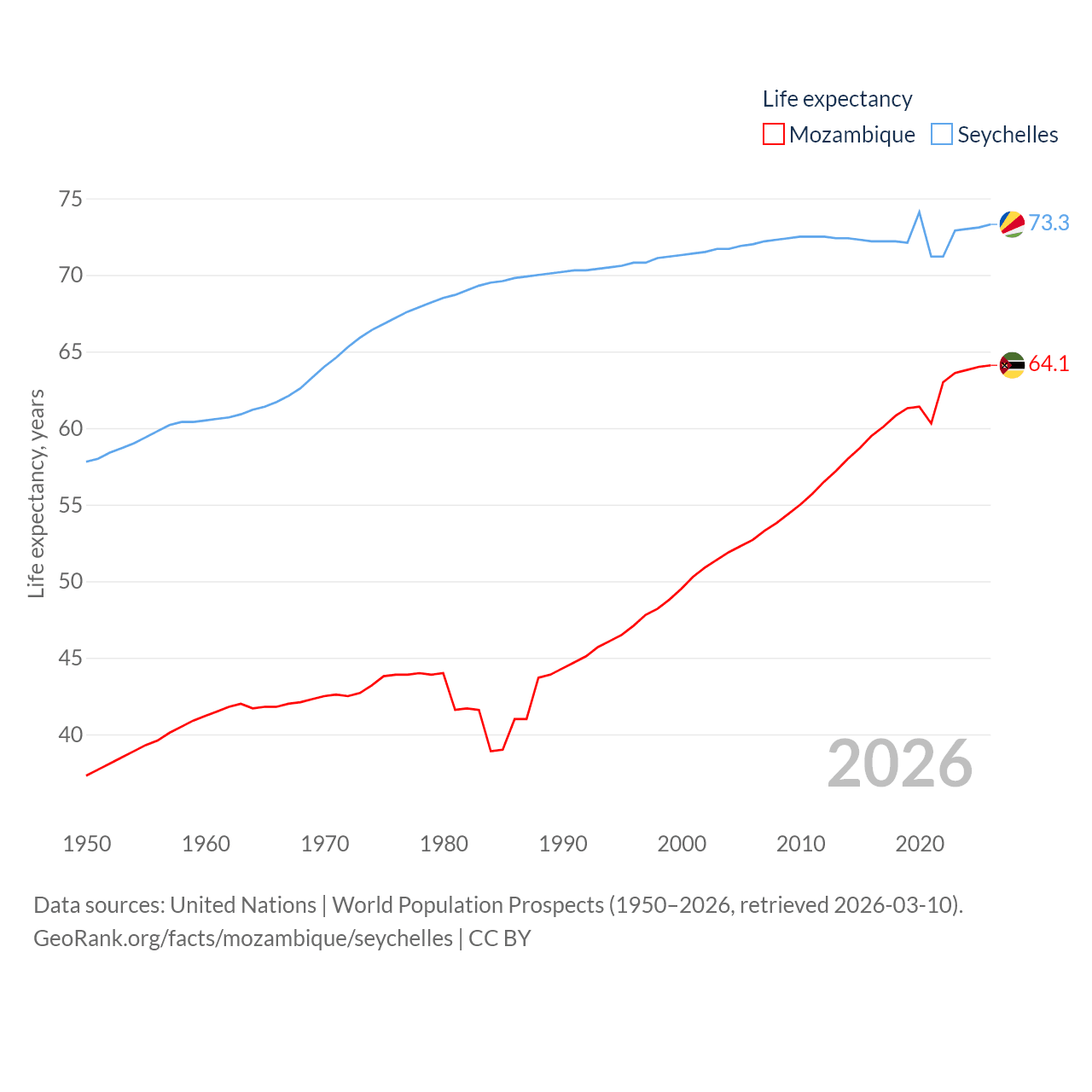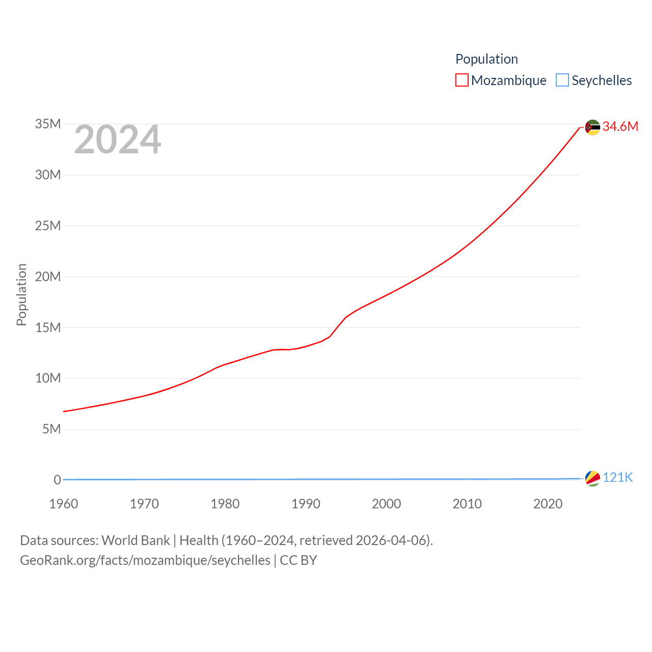 Mozambique has a population of 34.6M (ranked 46/197), compared with 121K in The Seychelles (ranked 181/197). Mozambique's land area is 303,623 sq mi versus 177.6 sq mi for The Seychelles (ranked 34th vs. 181st).