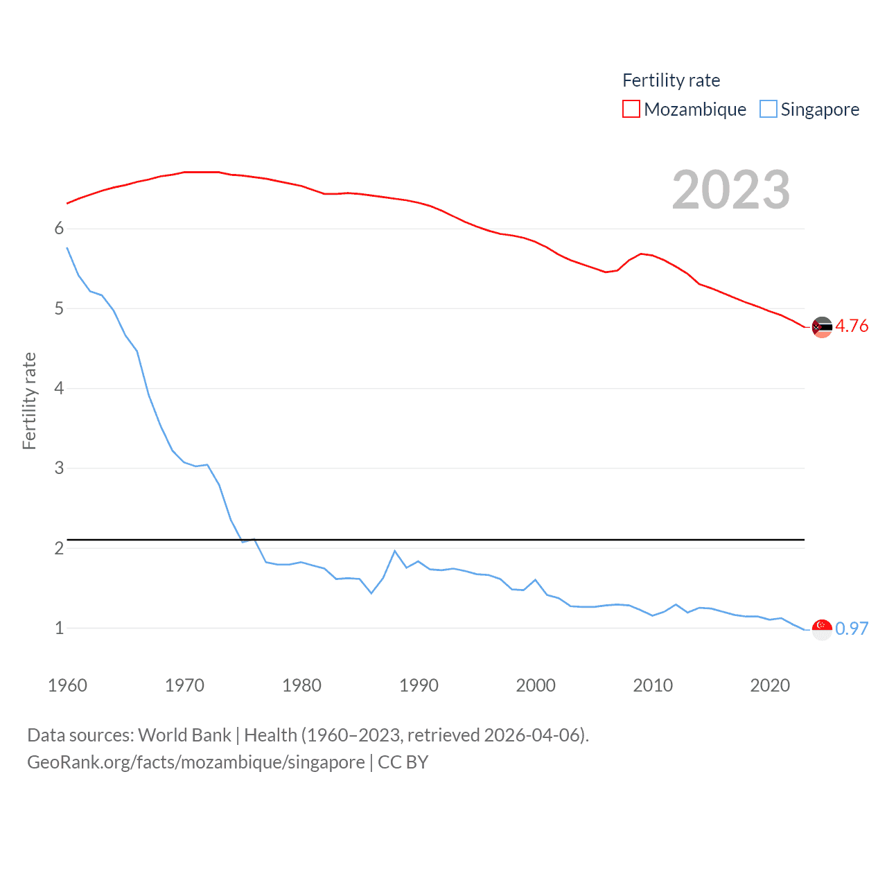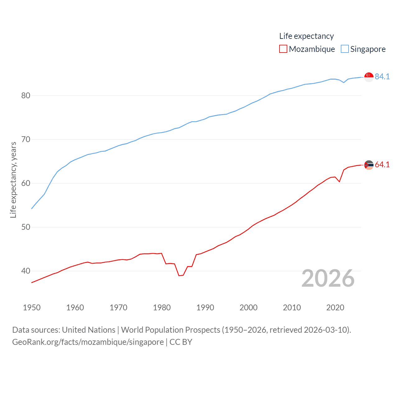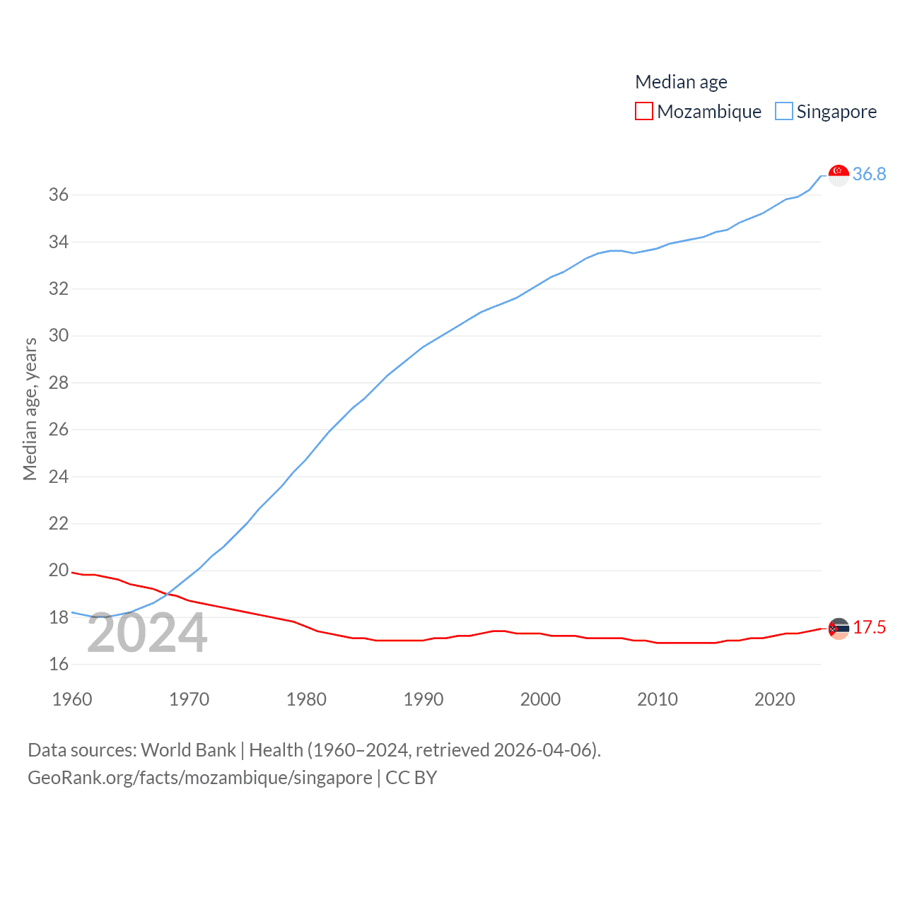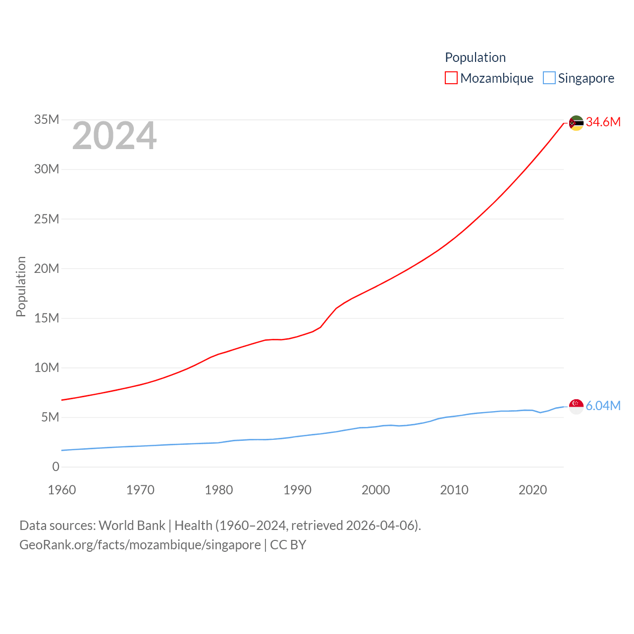 Mozambique has a population of 34.6M (ranked 46/197), compared with 6.04M in Singapore (ranked 113/197). Mozambique's land area is 303,623 sq mi versus 277.2 sq mi for Singapore (ranked 34th vs. 177th).