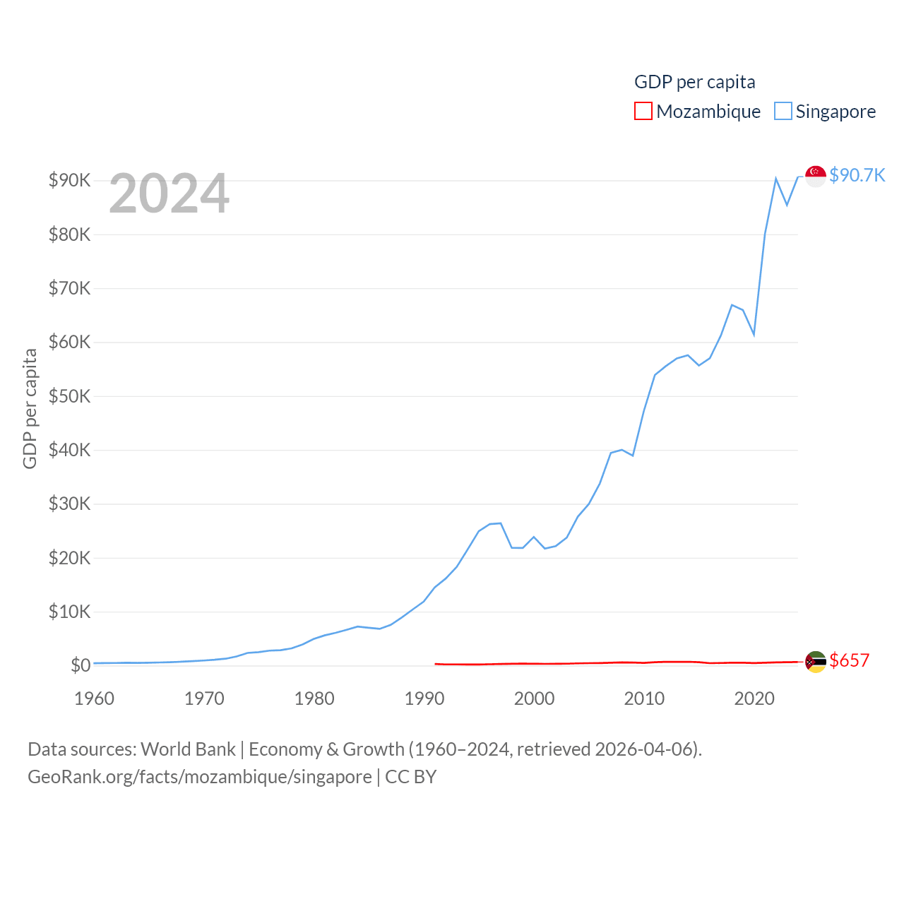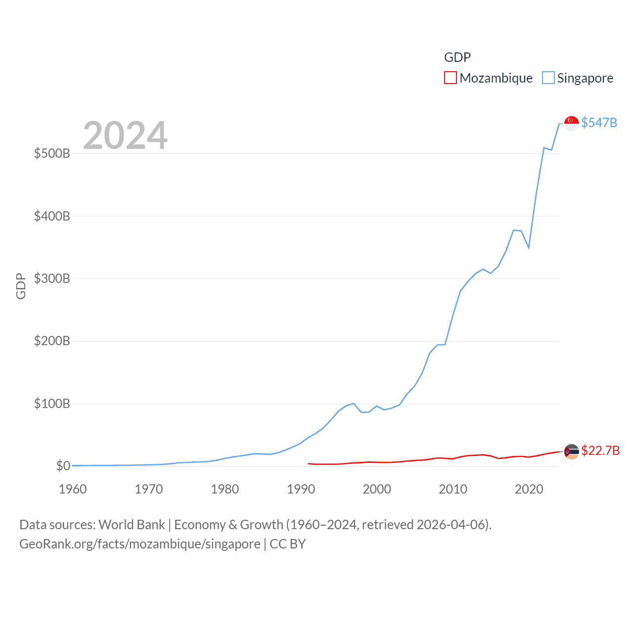 By GDP, Mozambique ranks 123/197 ($22.7B) and Singapore ranks 28/197 ($547B). By GDP per capita, Mozambique ranks 189/197 ($657), while Singapore ranks 7/197 ($90,674).