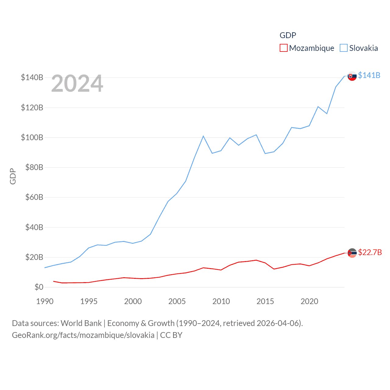 By GDP, Mozambique ranks 123/197 ($22.7B) and Slovakia ranks 61/197 ($141B). By GDP per capita, Mozambique ranks 189/197 ($657), while Slovakia ranks 47/197 ($25,993).