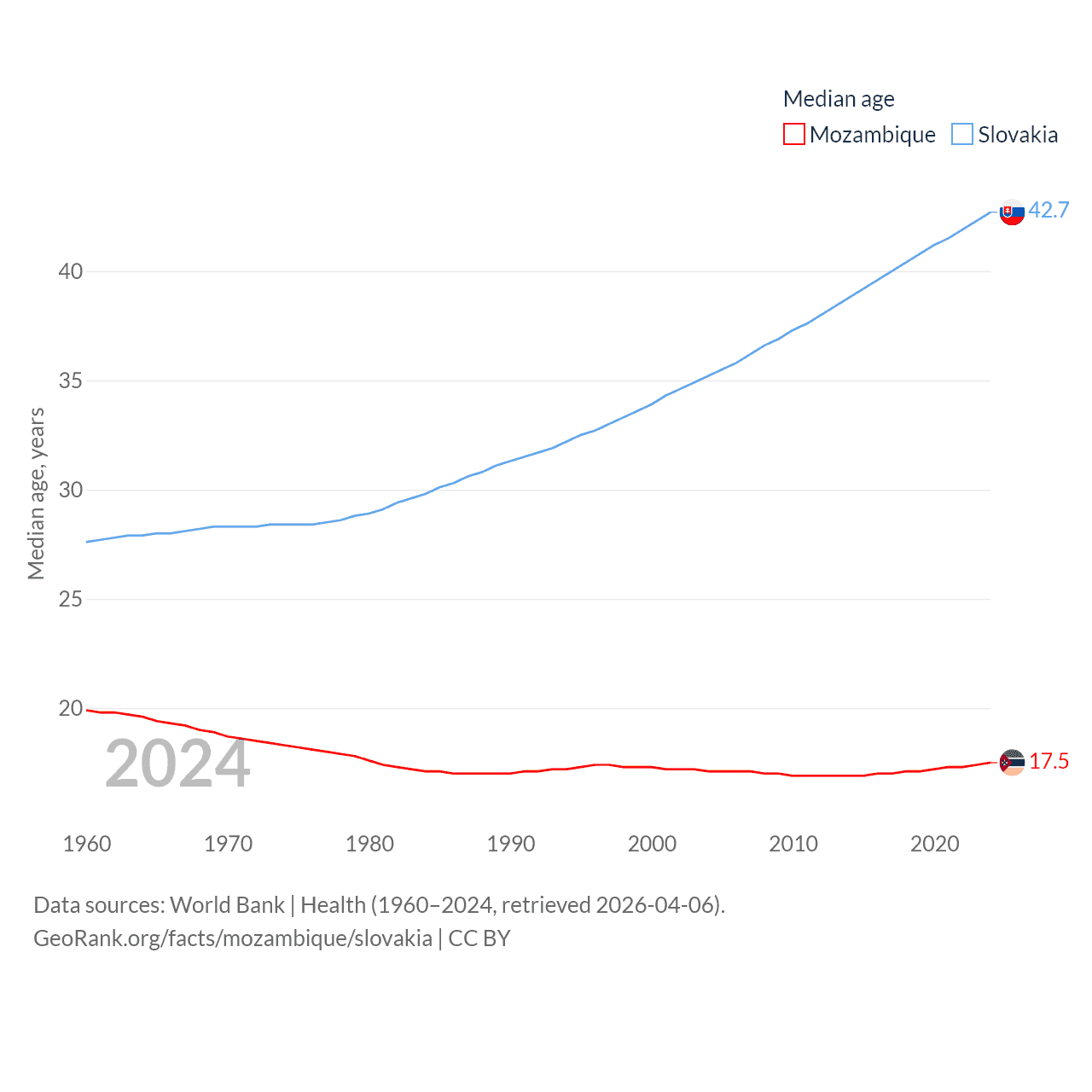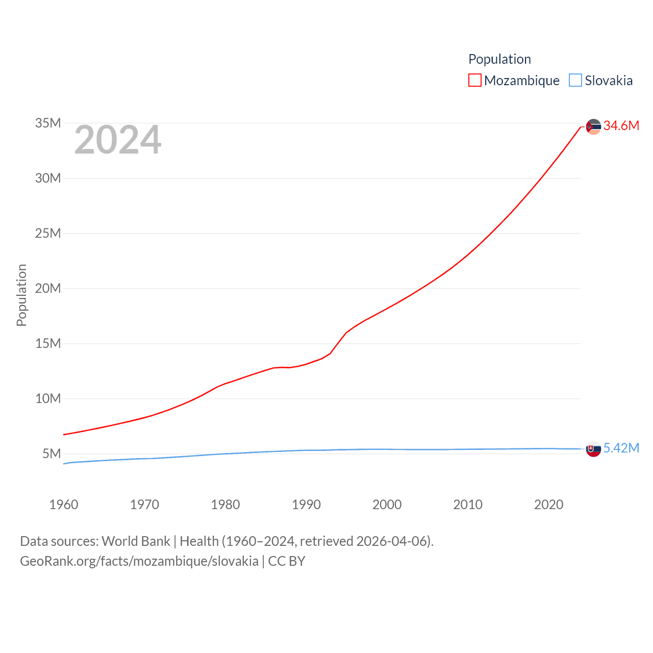 Mozambique has a population of 34.6M (ranked 46/197), compared with 5.42M in Slovakia (ranked 119/197). Mozambique's land area is 303,623 sq mi versus 18,564 sq mi for Slovakia (ranked 34th vs. 128th).