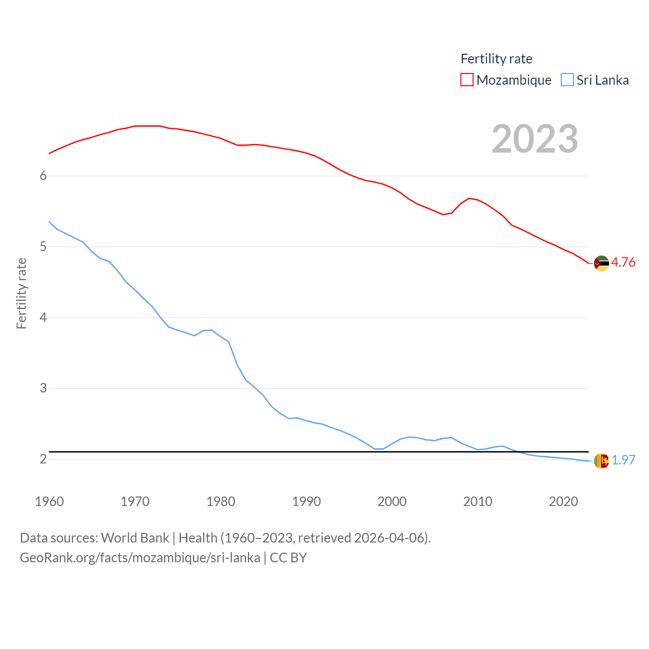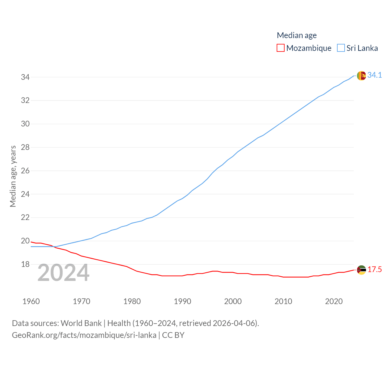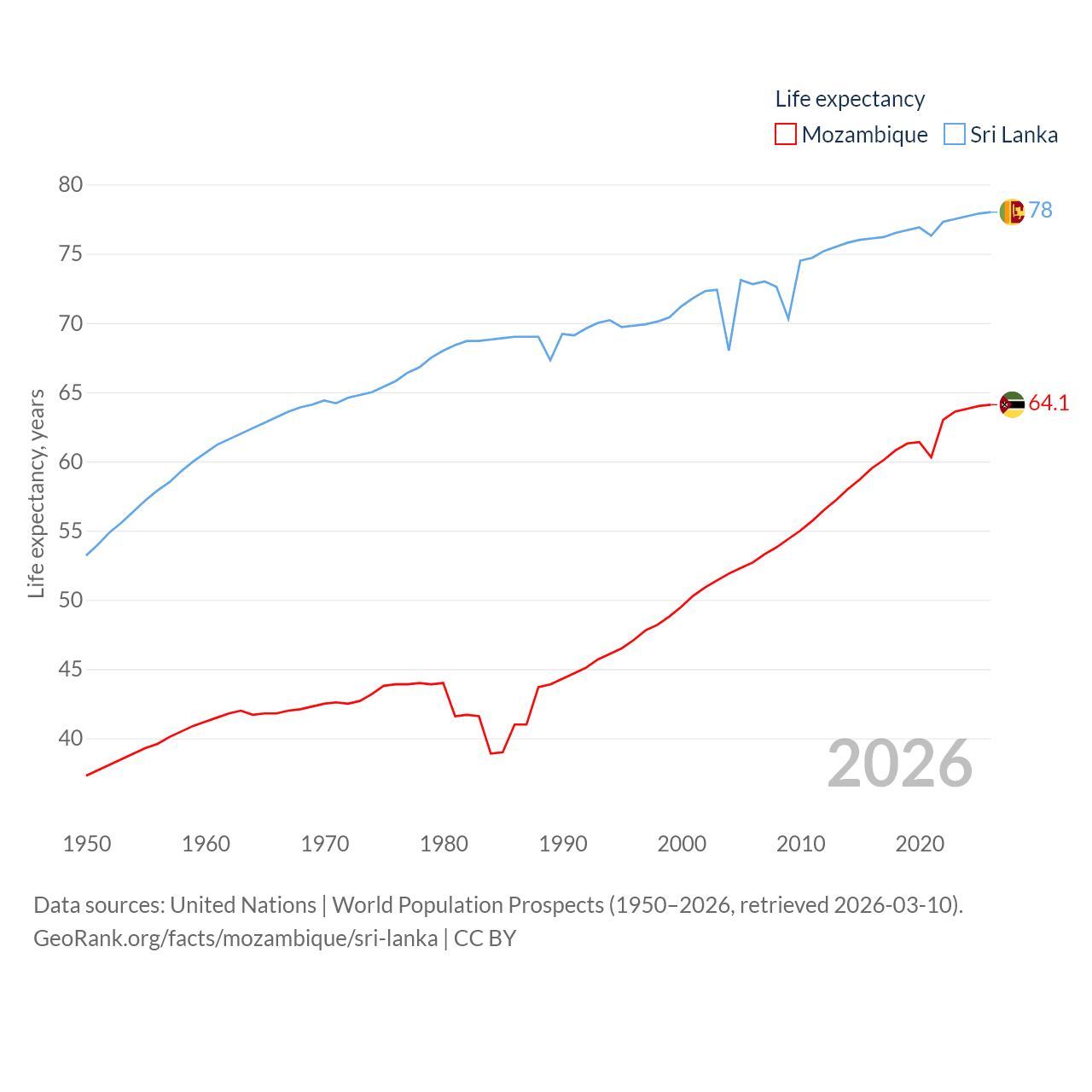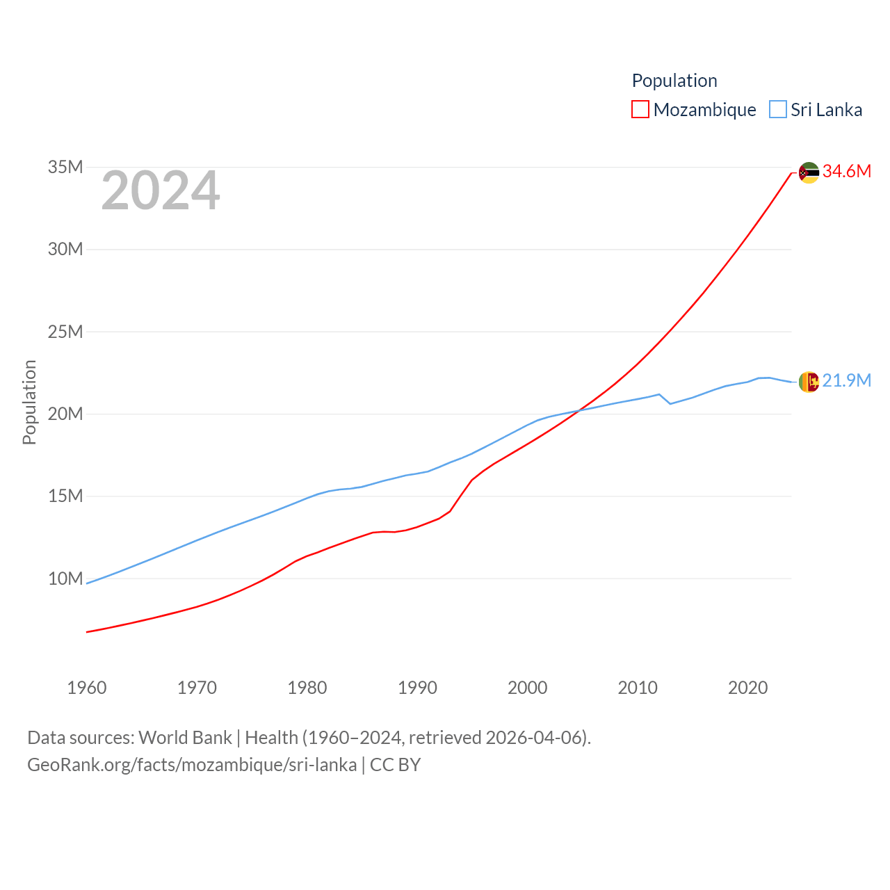 Mozambique has a population of 34.6M (ranked 46/197), compared with 21.9M in Sri Lanka (ranked 61/197). Mozambique's land area is 303,623 sq mi versus 23,884 sq mi for Sri Lanka (ranked 34th vs. 122nd).
