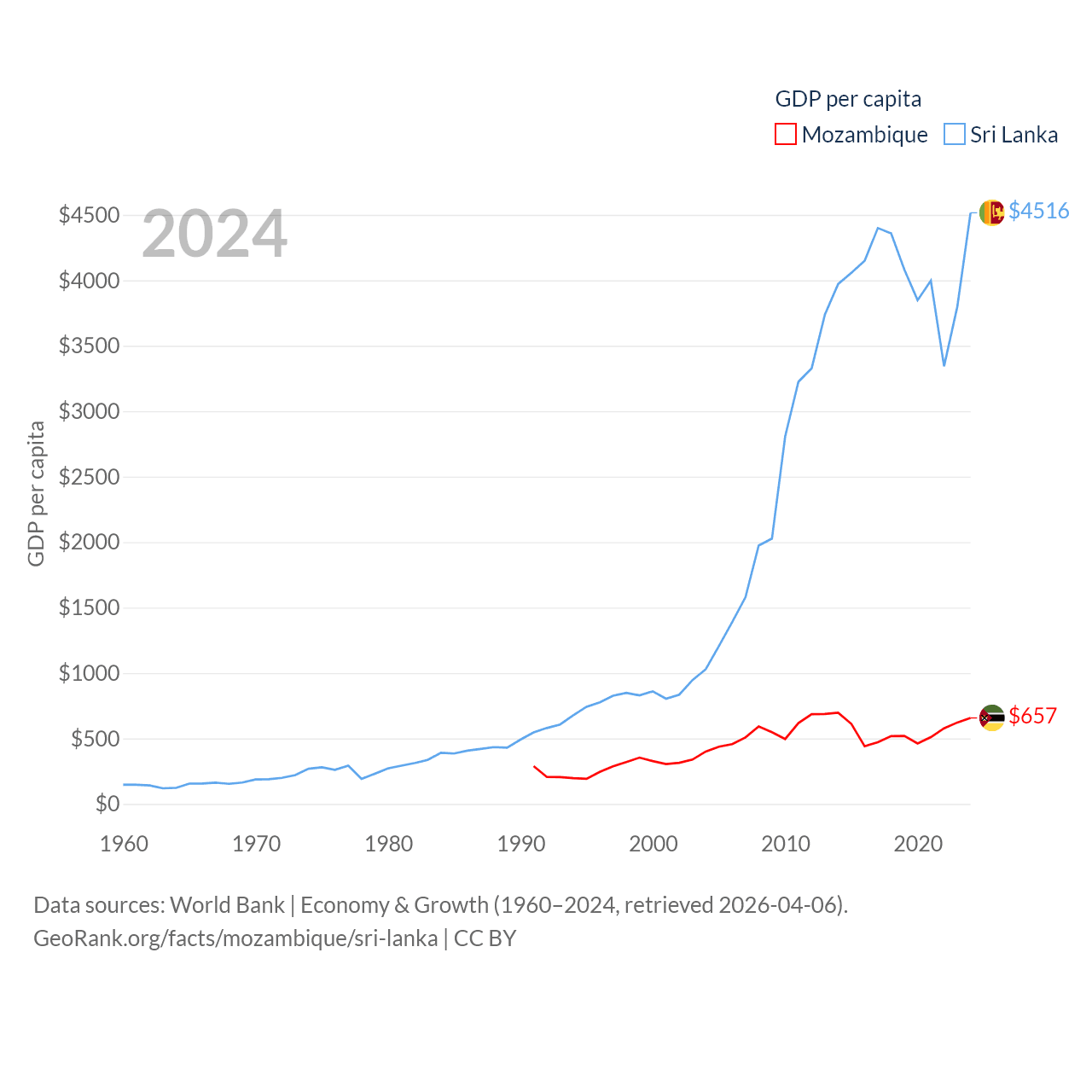 By GDP, Mozambique ranks 123/197 ($22.7B) and Sri Lanka ranks 72/197 ($99B). By GDP per capita, Mozambique ranks 189/197 ($657), while Sri Lanka ranks 124/197 ($4,516).