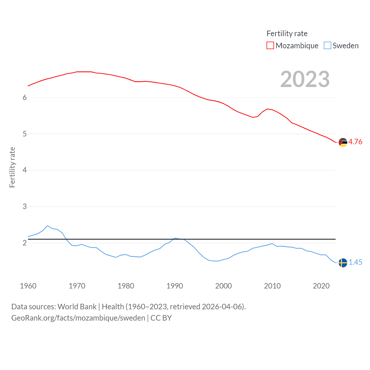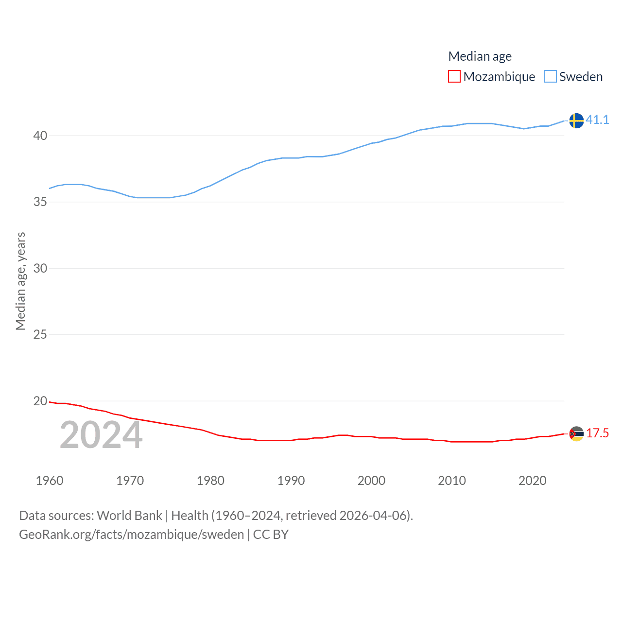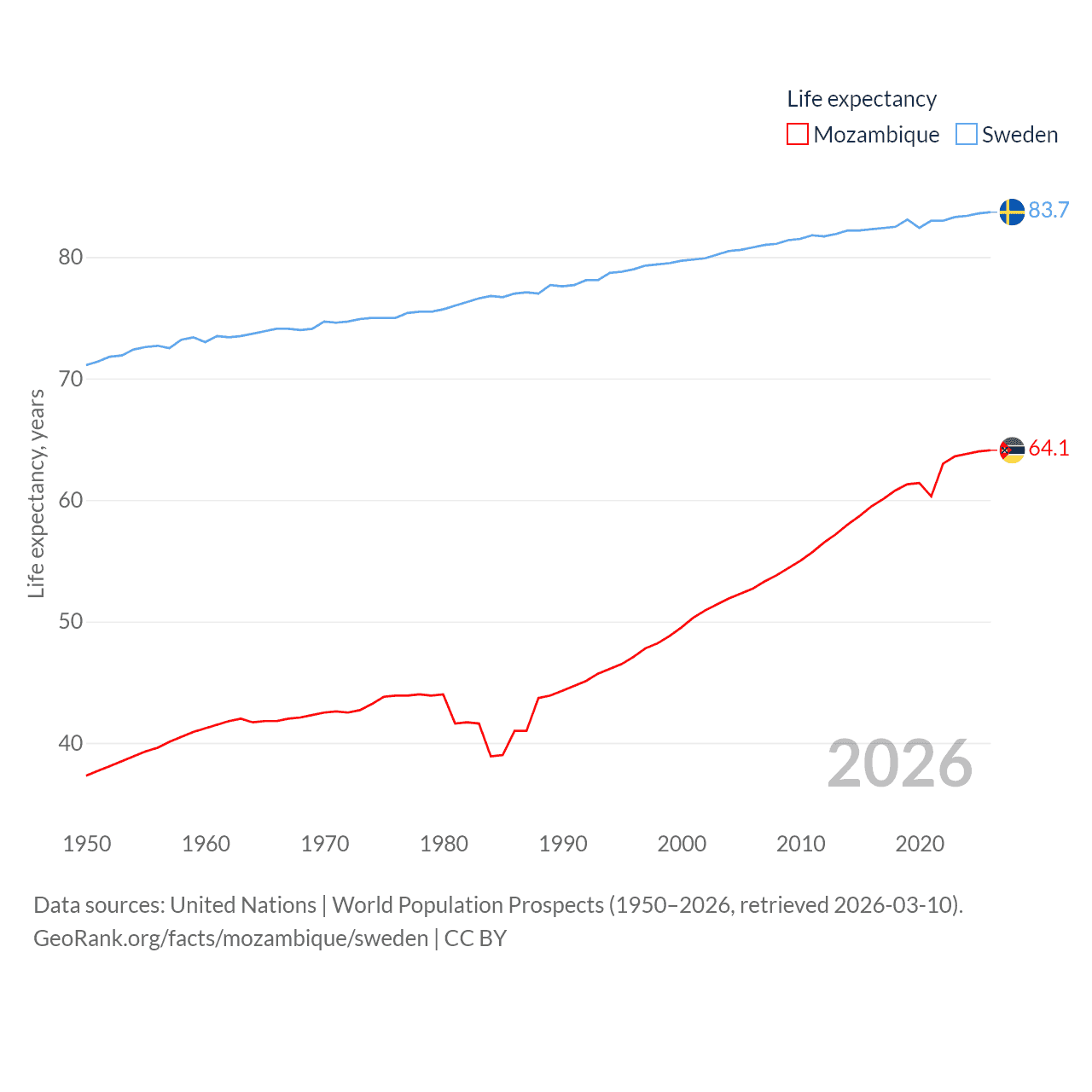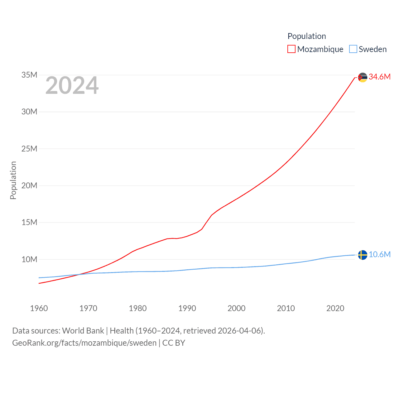 Mozambique has a population of 34.6M (ranked 46/197), compared with 10.6M in Sweden (ranked 93/197). Mozambique's land area is 303,623 sq mi versus 157,248 sq mi for Sweden (ranked 34th vs. 58th).