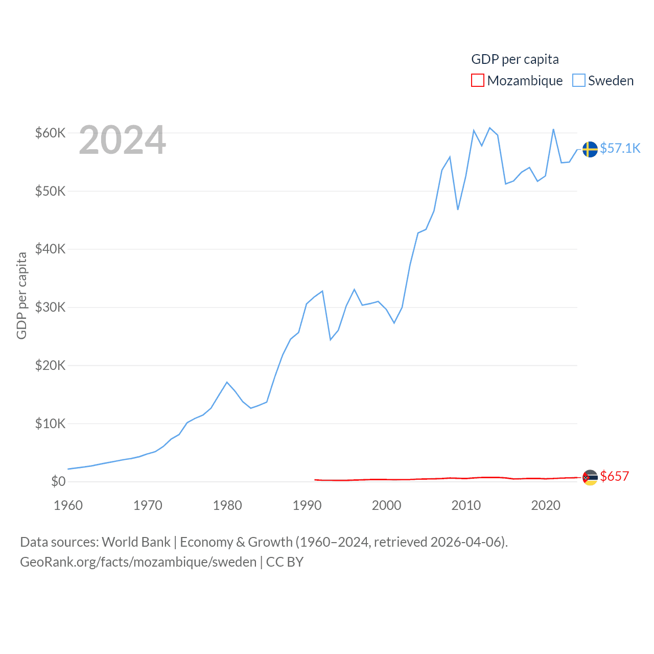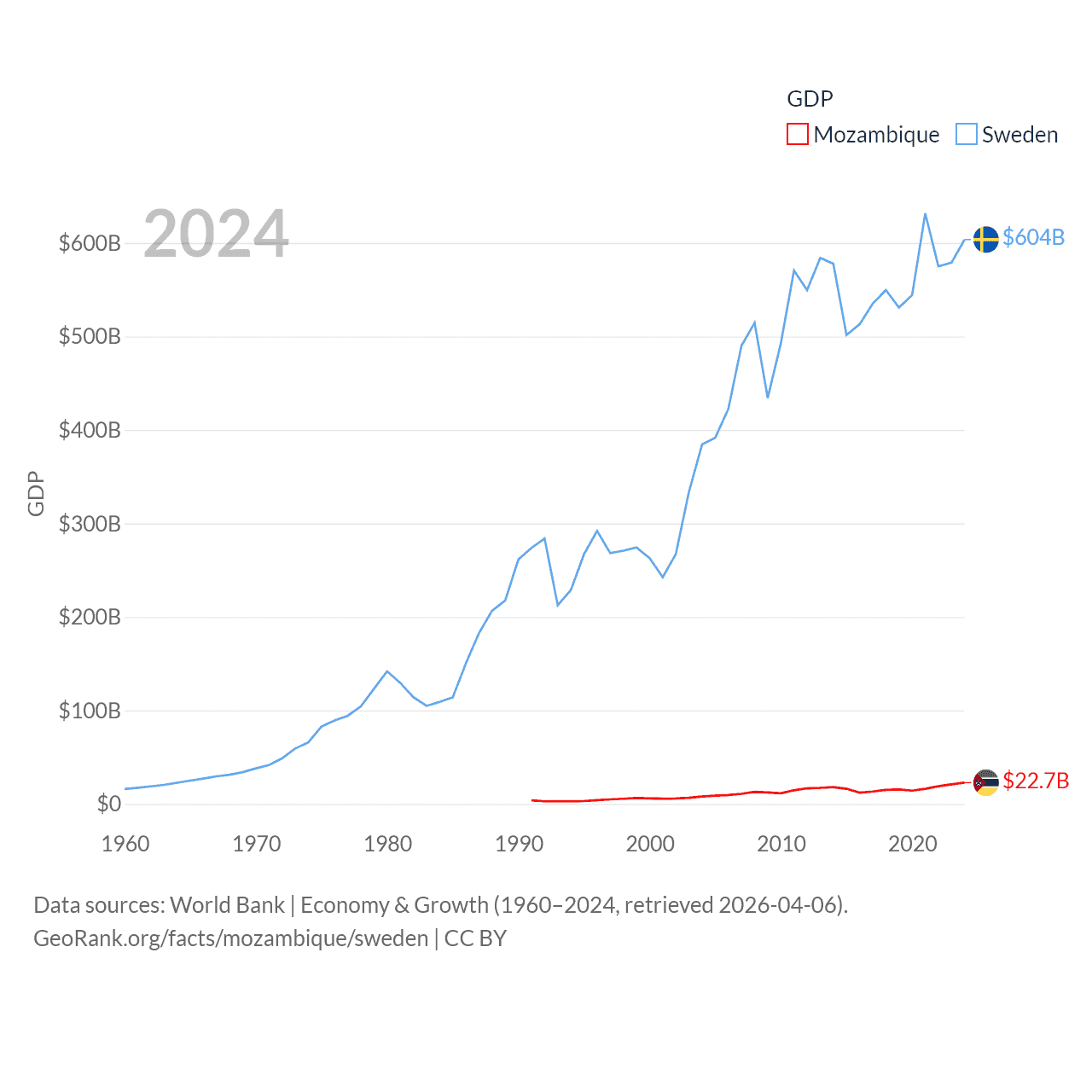 By GDP, Mozambique ranks 123/197 ($22.7B) and Sweden ranks 26/197 ($604B). By GDP per capita, Mozambique ranks 189/197 ($657), while Sweden ranks 17/197 ($57,117).
