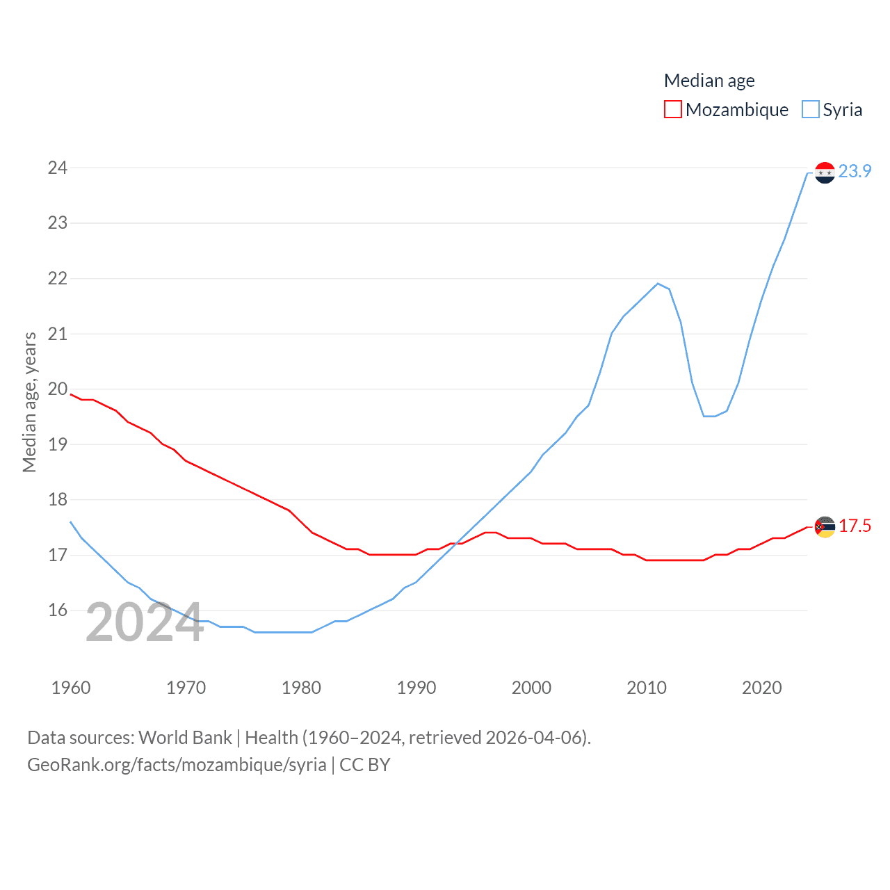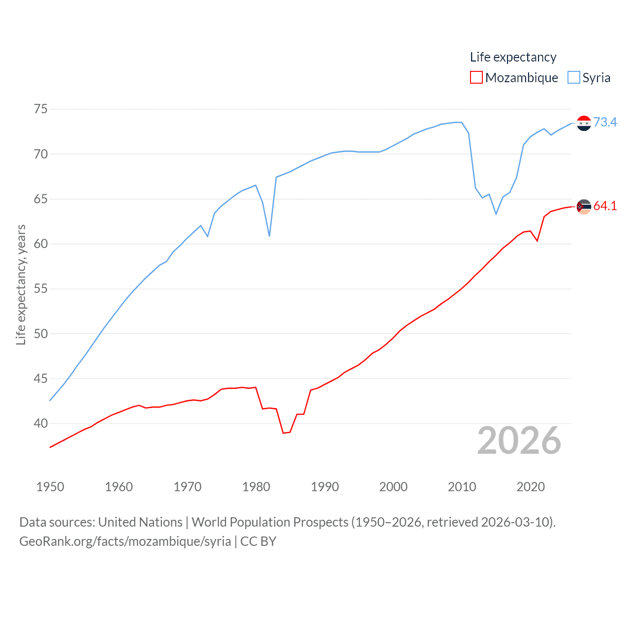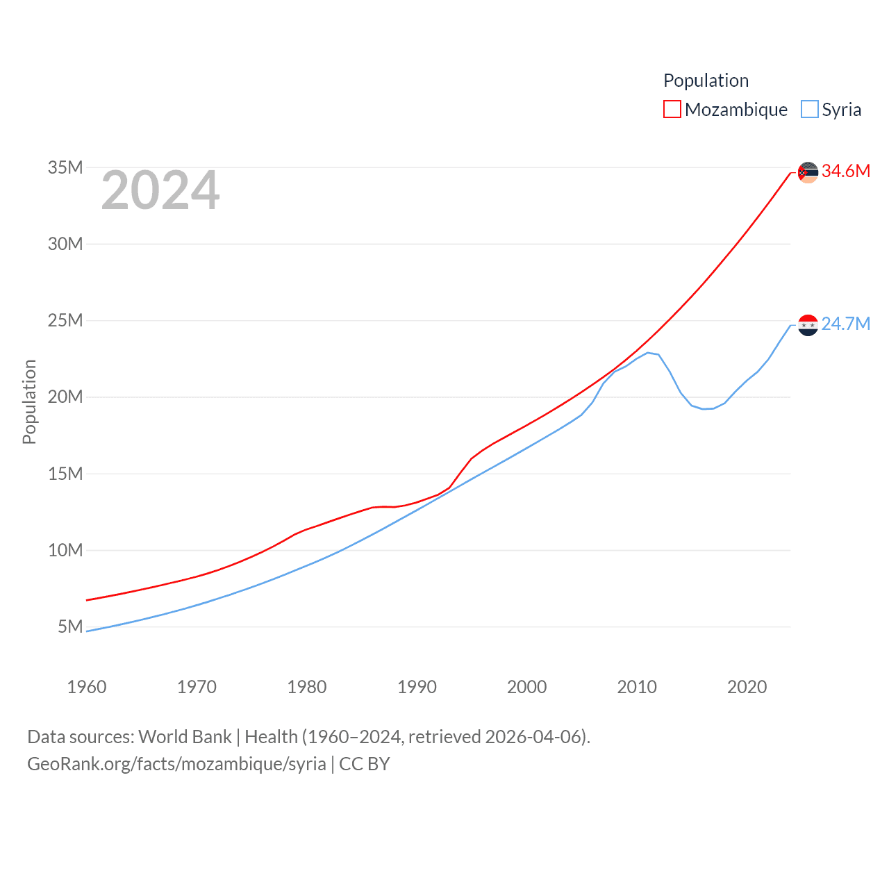 Mozambique has a population of 34.6M (ranked 46/197), compared with 24.7M in Syria (ranked 57/197). Mozambique's land area is 303,623 sq mi versus 70,900 sq mi for Syria (ranked 34th vs. 87th).