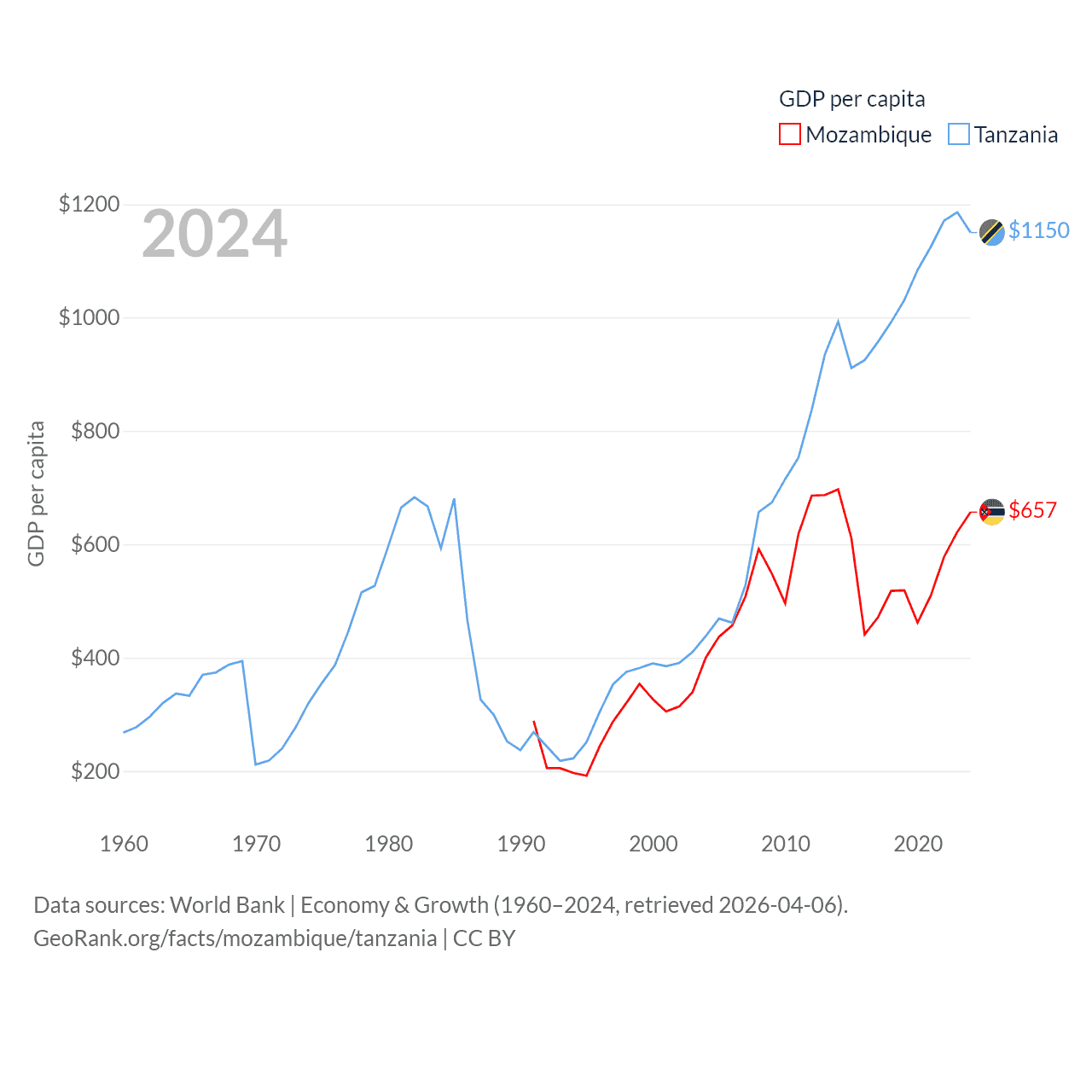 By GDP, Mozambique ranks 123/197 ($22.7B) and Tanzania ranks 82/197 ($78.8B). By GDP per capita, Mozambique ranks 189/197 ($657), while Tanzania ranks 170/197 ($1,150).