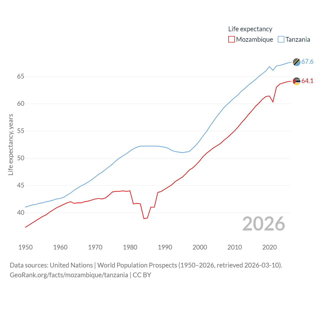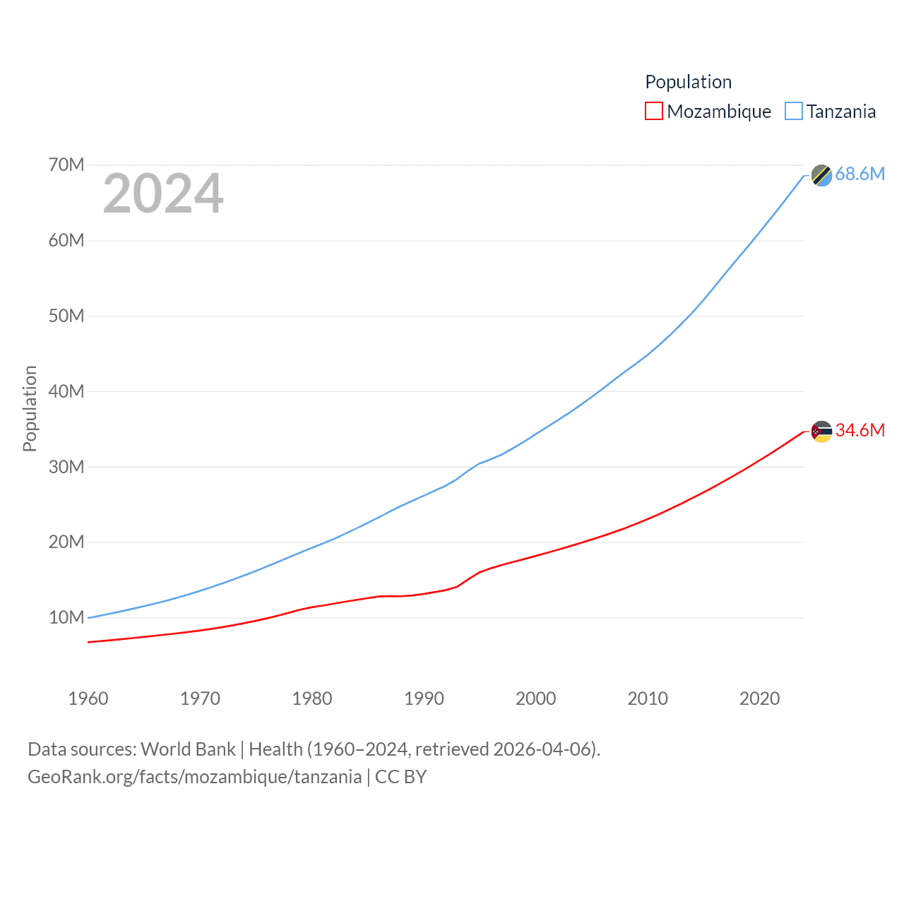 Mozambique has a population of 34.6M (ranked 46/197), compared with 68.6M in Tanzania (ranked 22/197). Mozambique's land area is 303,623 sq mi versus 342,009 sq mi for Tanzania (ranked 34th vs. 31st).
