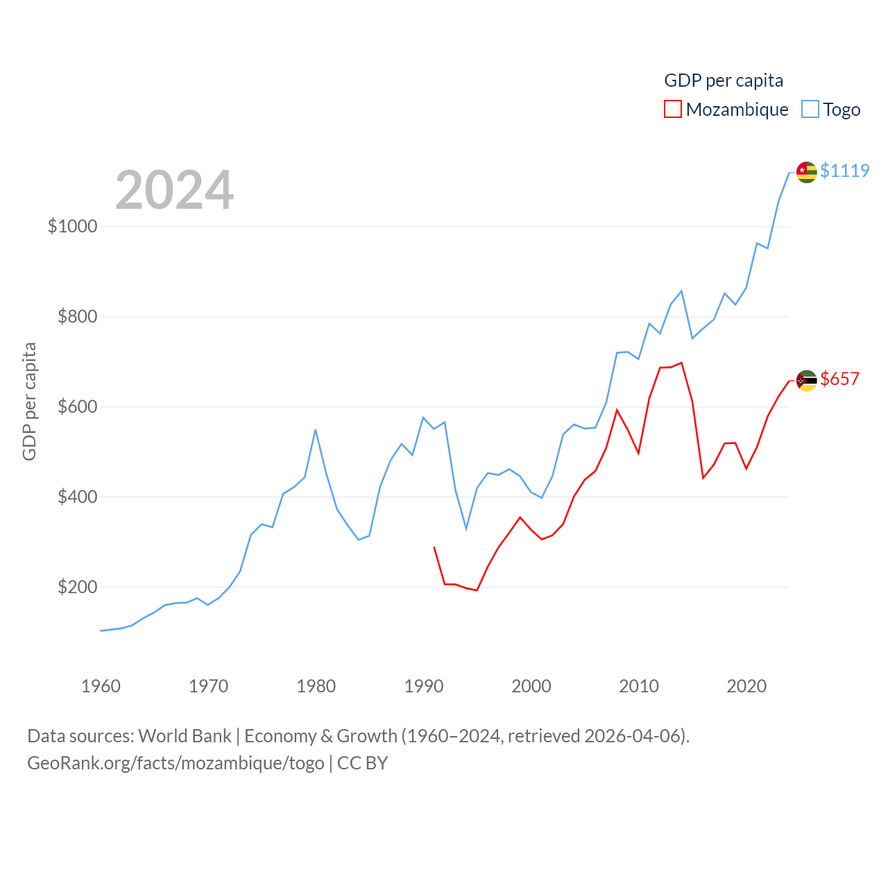 By GDP, Mozambique ranks 123/197 ($22.7B) and Togo ranks 154/197 ($10.7B). By GDP per capita, Mozambique ranks 189/197 ($657), while Togo ranks 172/197 ($1,119).