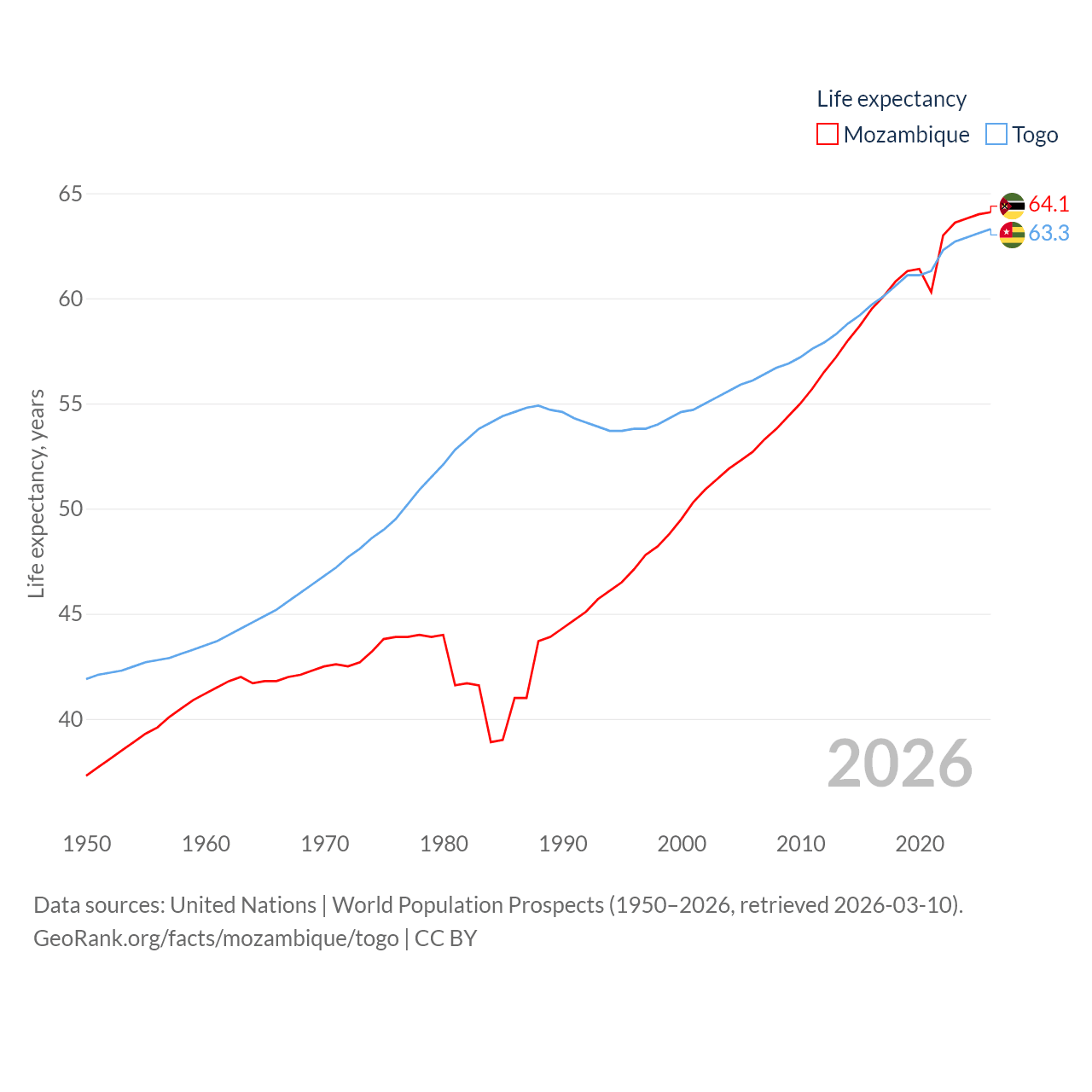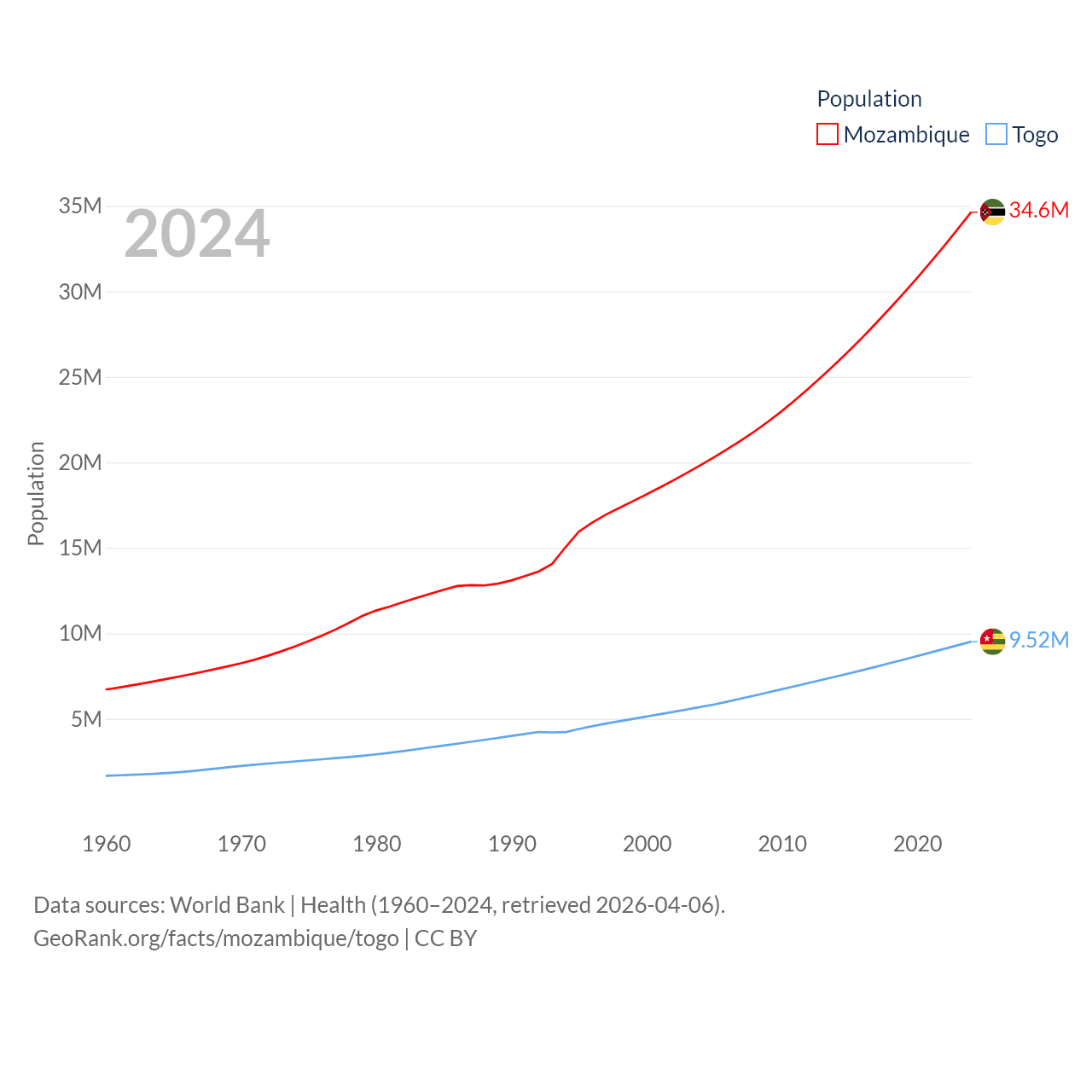 Mozambique has a population of 34.6M (ranked 46/197), compared with 9.52M in Togo (ranked 98/197). Mozambique's land area is 303,623 sq mi versus 21,000 sq mi for Togo (ranked 34th vs. 124th).