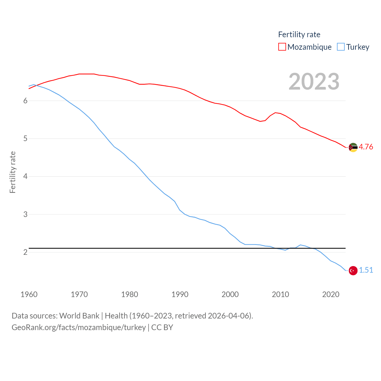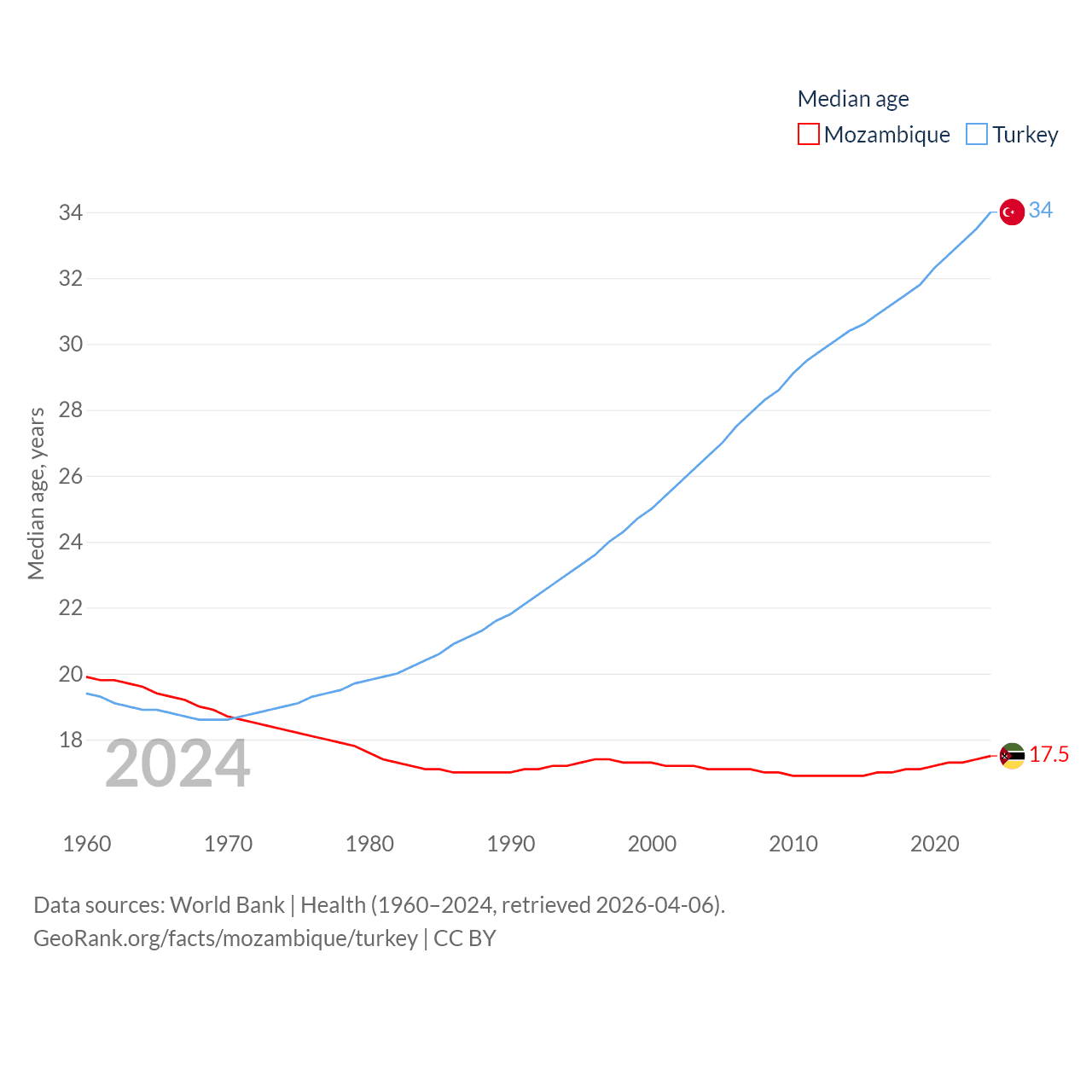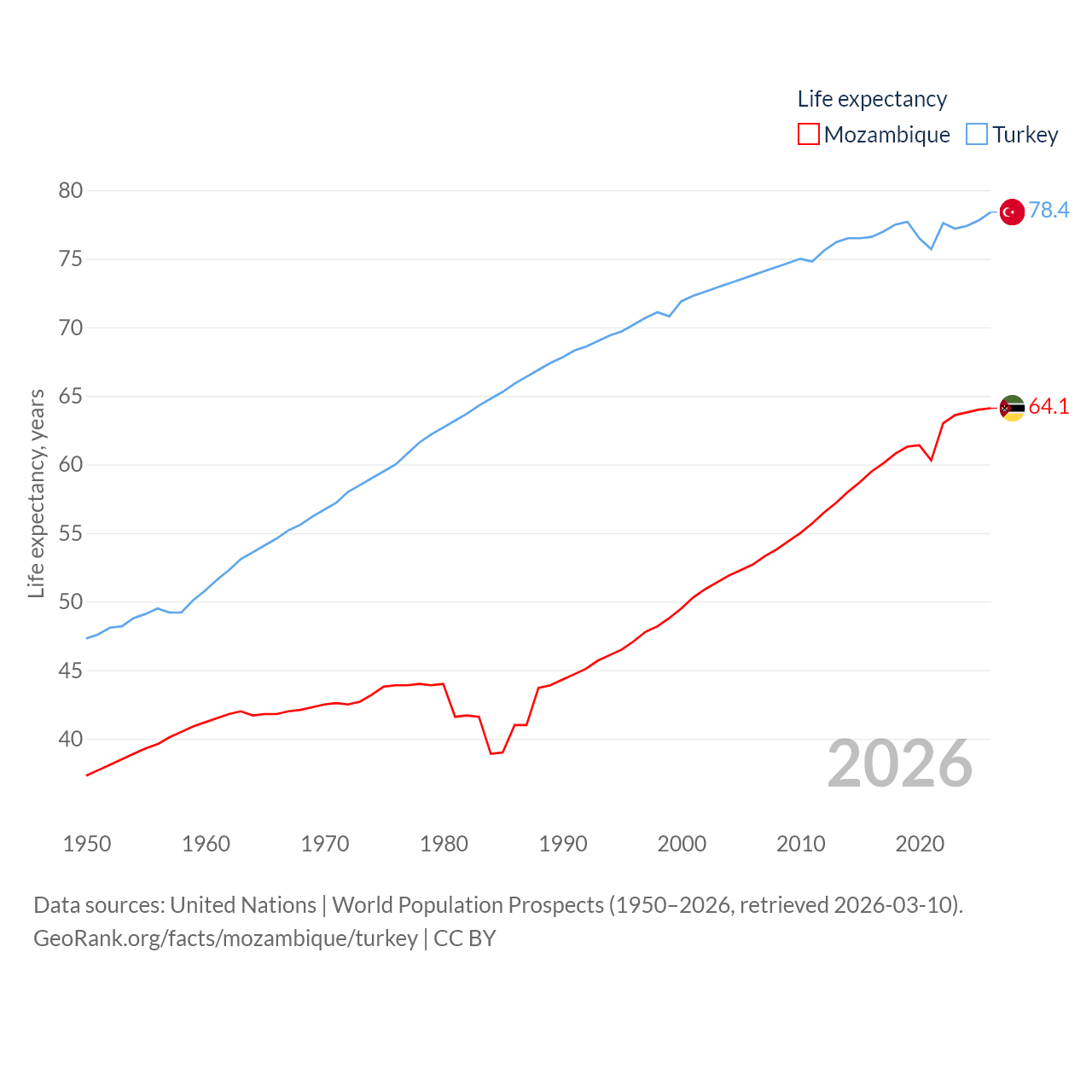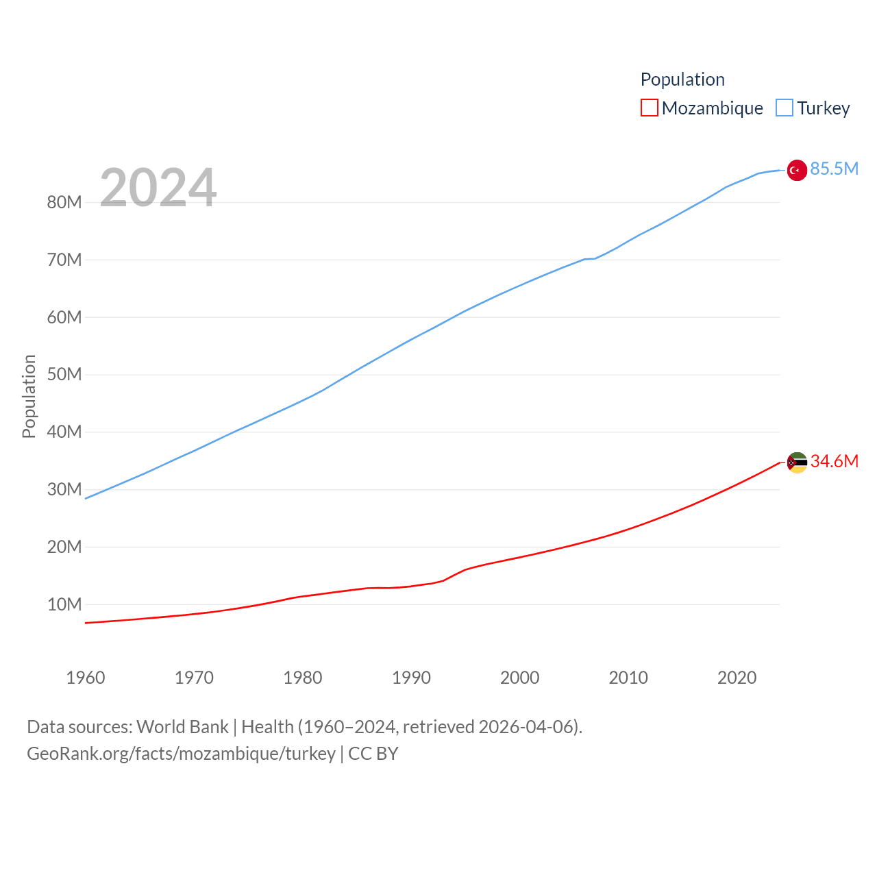 Mozambique has a population of 34.6M (ranked 46/197), compared with 85.5M in Turkey (ranked 18/197). Mozambique's land area is 303,623 sq mi versus 297,156 sq mi for Turkey (ranked 34th vs. 36th).